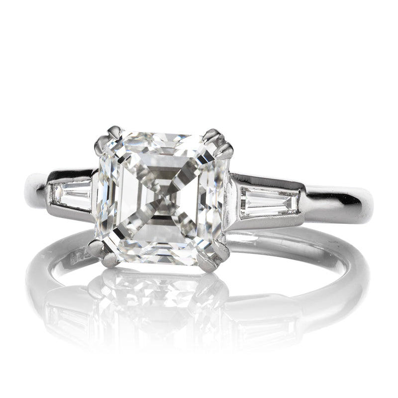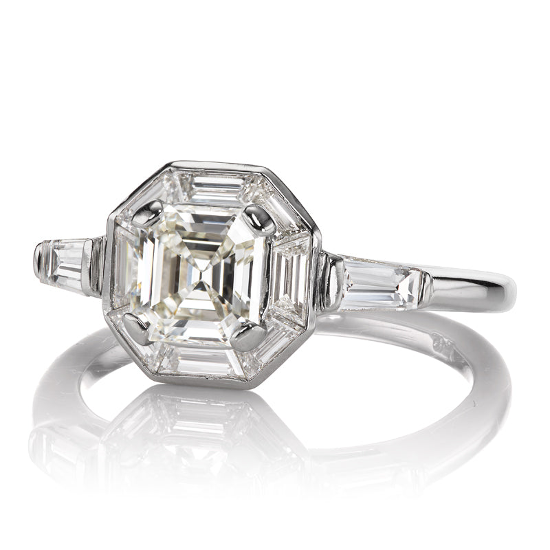 The Asscher cut was first created in 1902 by Joseph Asscher and became popular during the Art Deco era of the 1920s. Asscher’s original process involved cutting a square-shaped diamond with 58 facets. Later, the Royal Asscher Company would improve the brilliance of the cut with 74 facets.