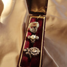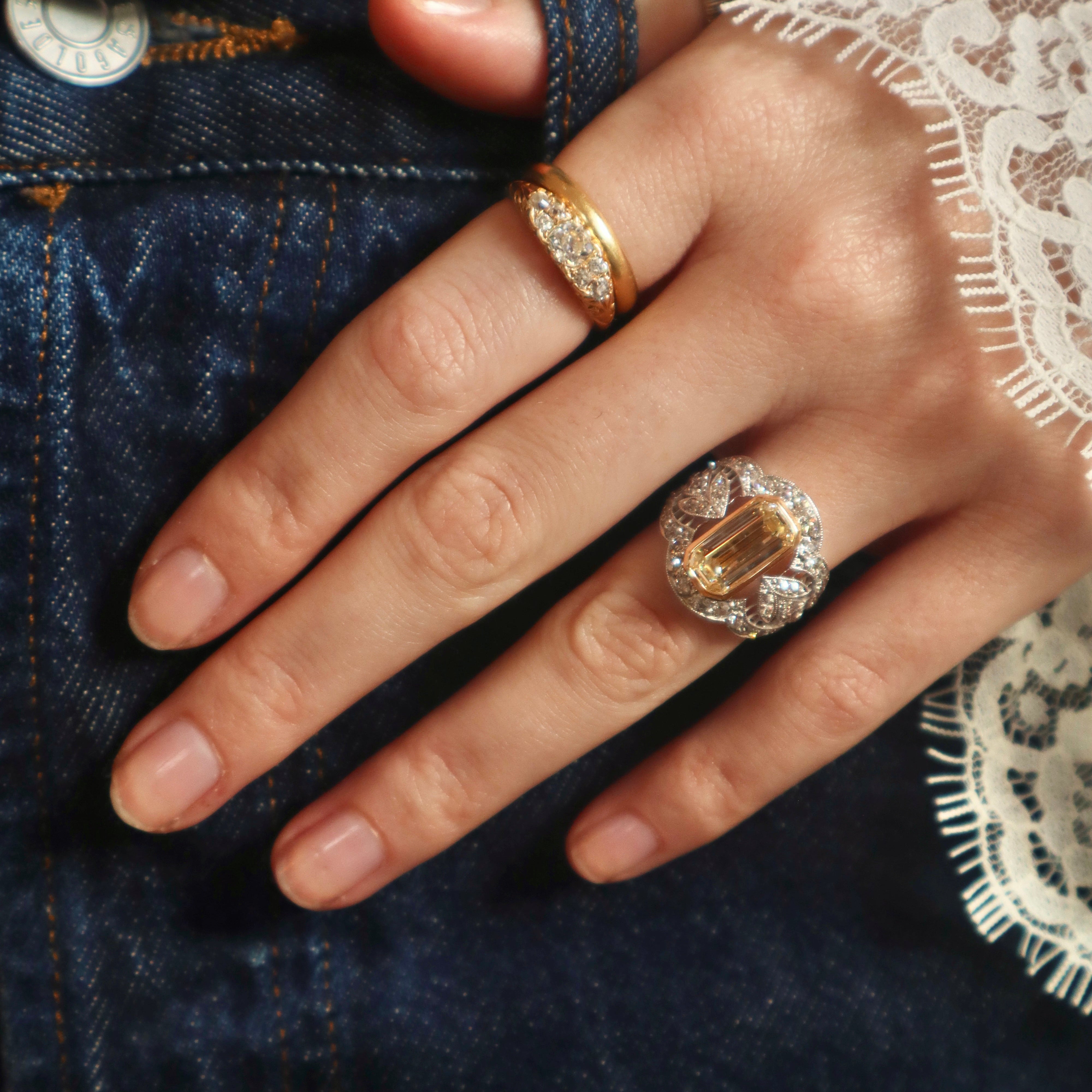 A showstopper of a piece! The ring itself is an original Edwardian piece with delicate filigree, leaf-like motifs, and a high attention to detail. The center stone appears to be a later addition, but fits in like a dream, suggesting a thoughtful curation that honors the ring's historical integrity. Its warm yellow bezel adds a striking contrast and a touch of whimsy, while an additional 50 diamonds are arranged with such intention that they createan beautiful halo of shimmer. The airy, almost dancing metalwork gives the piece a sense of movement and lightness. Stunning as a chic engagement ring, and just as captivating worn on the index or middle finger.