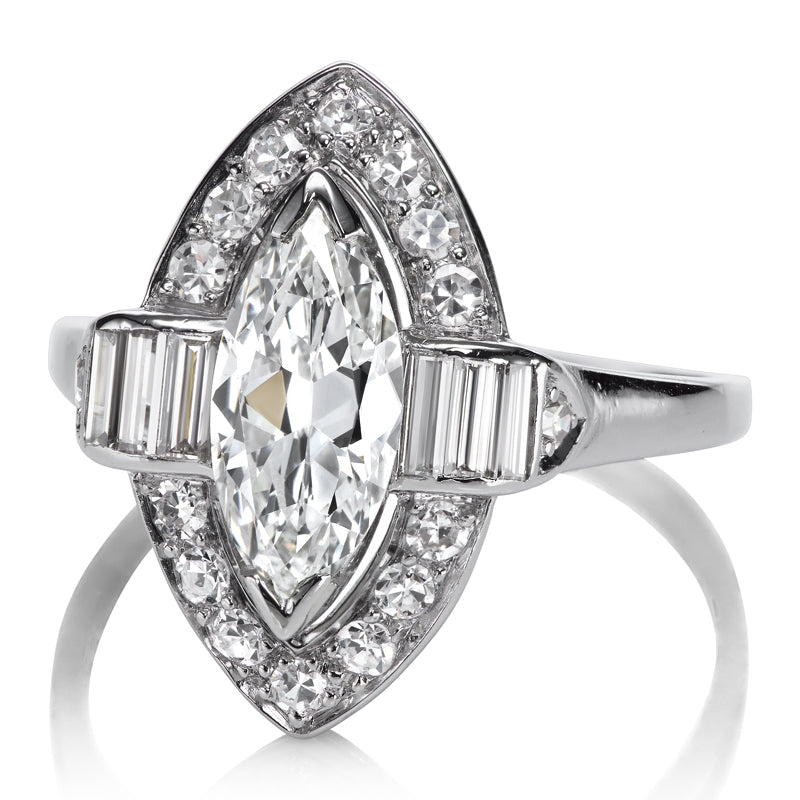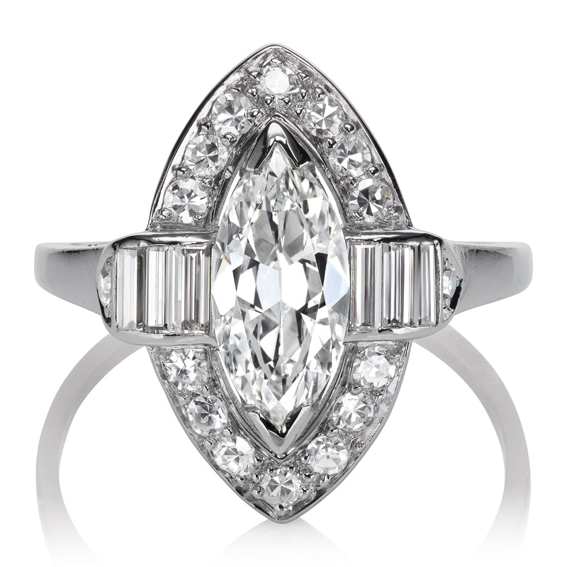 The Ivy ring is a marquise cut halo diamond engagement ring from the Art Deco Era, circa 1925! This ring centers a GIA-certified Marquise Cut diamond of 1.27 carats of I color, SI2 clarity. The diamond is set in a platinum setting with three vertically-set baguettes to each side. A halo of 14 round diamonds outlines the marquise shape with an additional round diamond outside of the baguettes. The side diamonds combine for approximately 0.45 carats. The ring is size 7.5 and can be resized!