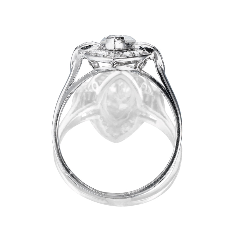 That old-cut marquise is a stunning shape with the prettiest of patterns! Combine that with sleek baguette side stones and a halo to bring high shine to this low-profile dream! And although it sits close to the finger, this ring has a great surface area and enough contrast in depth to keep you interested, with the central stone elevated slightly above the halo and the baguettes. The platinum setting is silky smooth and absolutely Art Deco, with charming little geometric patterns along open metalwork. This marquise cut halo diamond engagement ring is quite the stunner!