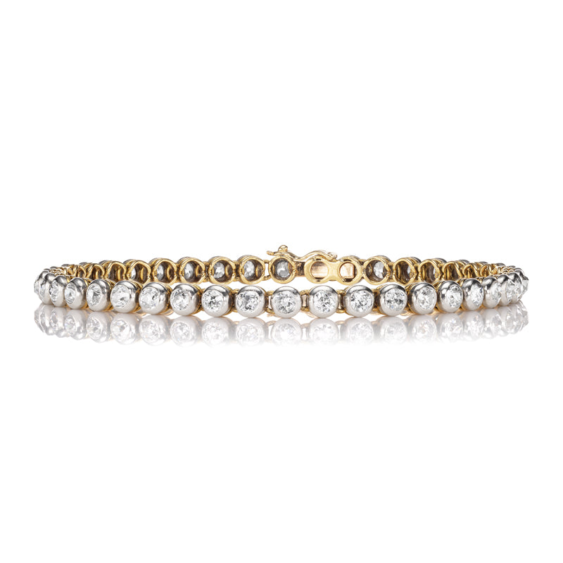 The Brooks Bracelet is an authentic antique bracelet from the Art Deco period. The bracelet has 41 Old European Cut diamonds totaling approximately 4.10 carats of I-J color, VS-SI clarity. The diamonds are bezel-set into a Platinum atop an 18kt yellow gold setting. The bracelet is 7.75 inches long.