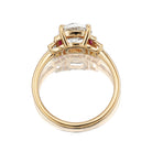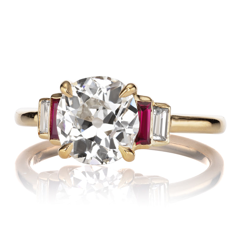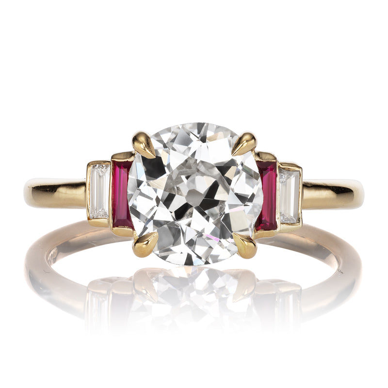 The Camille 1.87 ring is an AB original design. The ring centers a GIA-certified 1.87-carat Old Mine Cut diamond of J color, SI1 clarity. The stone is set in a 4-prong 18kt setting of our signature 18kt yellow gold with a vertical baguette and ruby bezel-set to each side of the center stone. The ring is currently size 6+ (a hair over a 6) and can be resized!