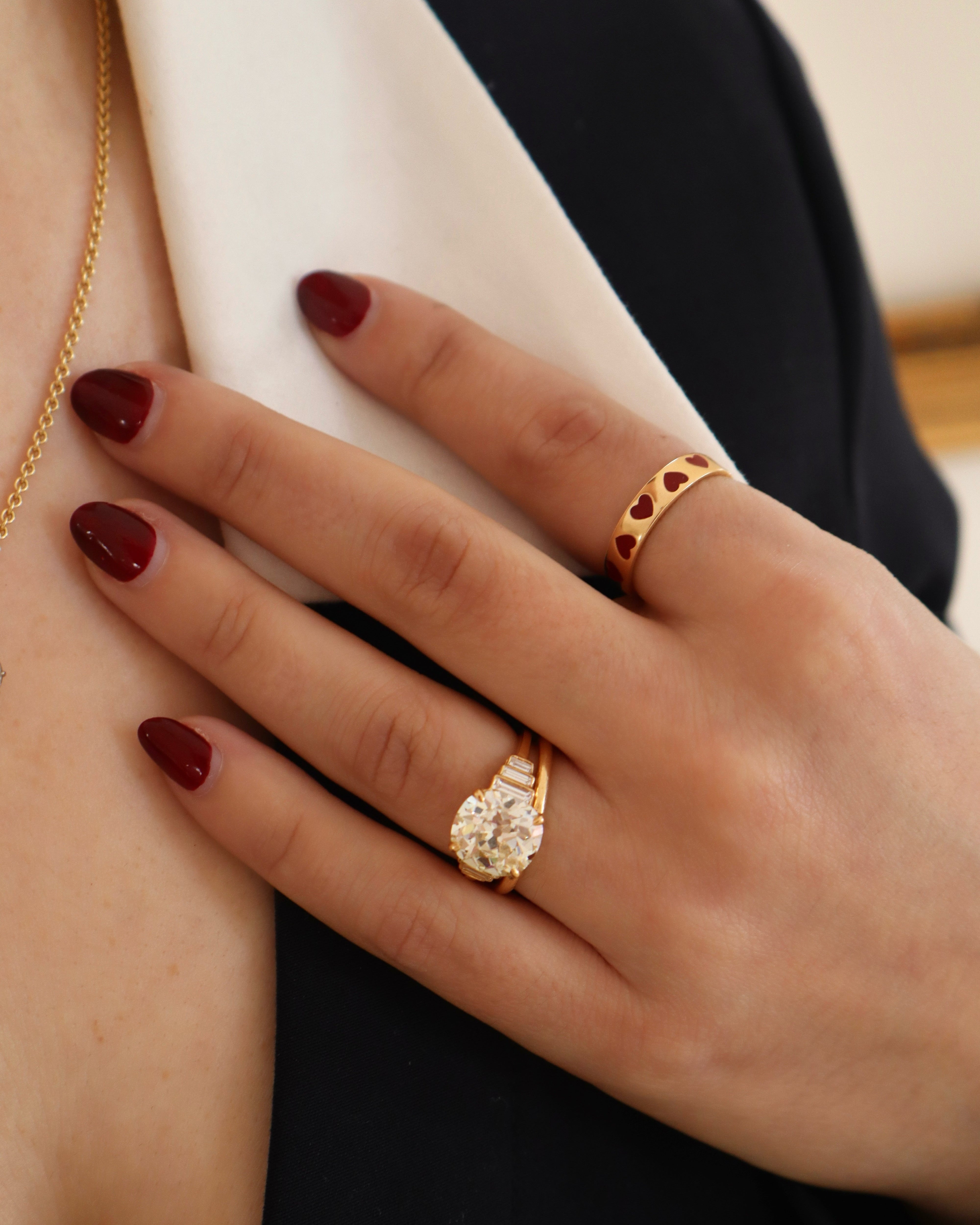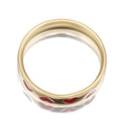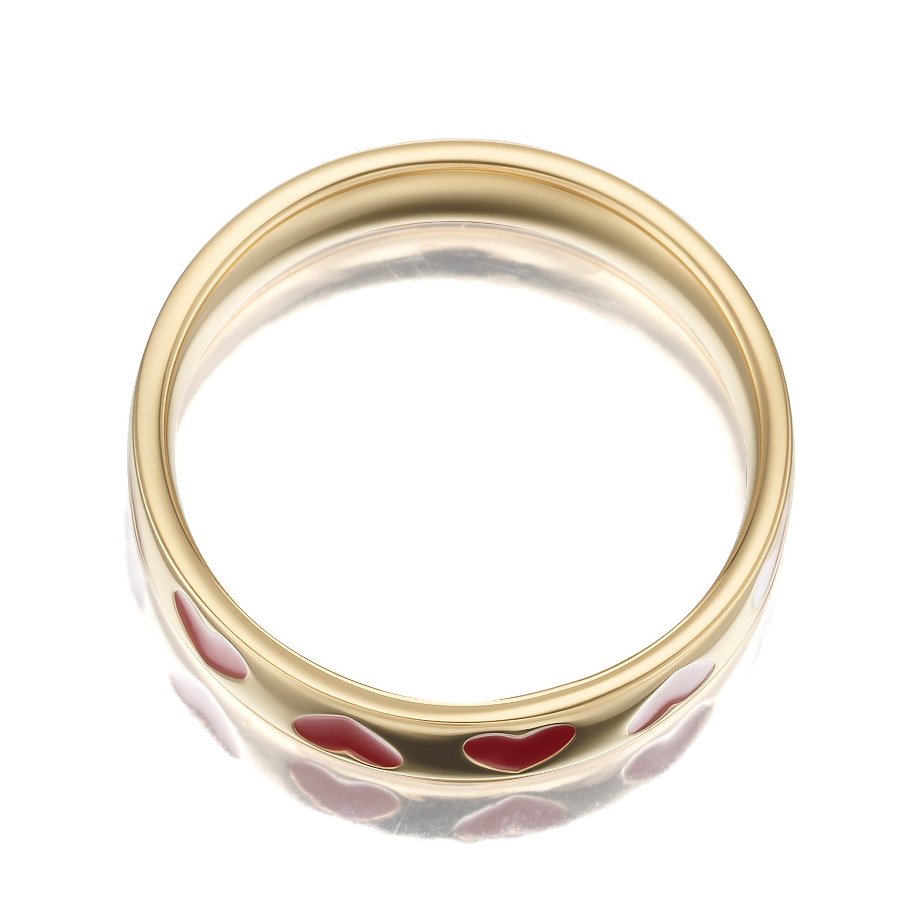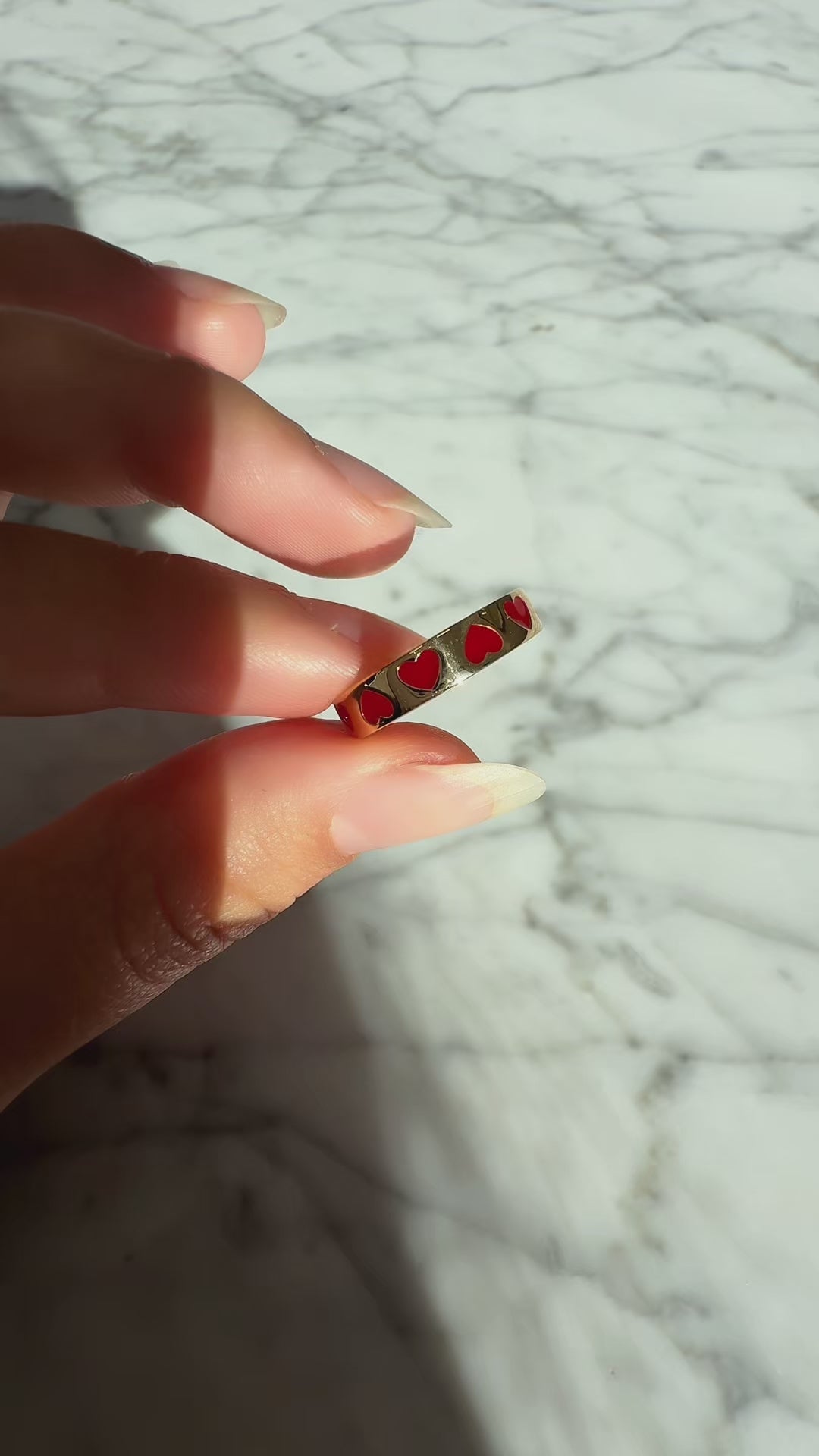 The Queen of Hearts band is an AB original. This golden band features enamel-filled hearts that wrap continuously around the band. Offered in two lovely hues- Cherry Rose or Nudey Rose. The band is 4mm wide by 1.3mm tall.