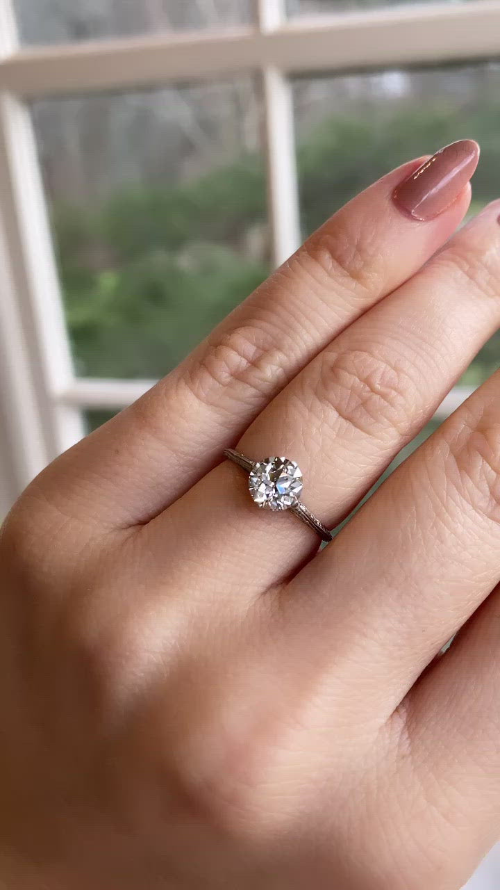 The Karter ring is an authentic vintage diamond engagement ring Art Deco Era circa 1915. The ring centers a GIA certified 1.11-carat old European cut diamond of H color, VS1 clarity. The stone is set in a platinum setting that has original hand engravings down the sides of the band and delicate filigree in the gallery. The ring is currently size 6 and can be resized!