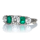 The Carlita ring is an authentic vintage diamond and emerald ring from the Edwardian Era circa 1900. The ring features two emeralds totaling approximately 0.50 carats and three Old Mine Cut diamonds of approximately J-K color and VS-SI clarity, totaling approximately 1.15 carats. The stones are set in an 18kt yellow gold setting. The ring is currently size 7 and can be resized!