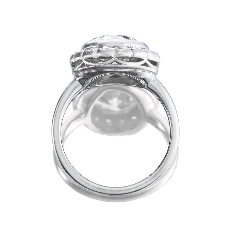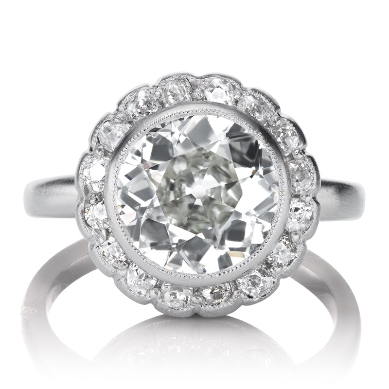 This platinum beauty is designed based on a vintage ring we once had! Hyacinthe 2.86 centers a bright, spready, and florally faceted OEC with 16 old cut diamonds creating a flower petal-like halo around the center stone. A magical engagement ring for a feminine and classic girl!