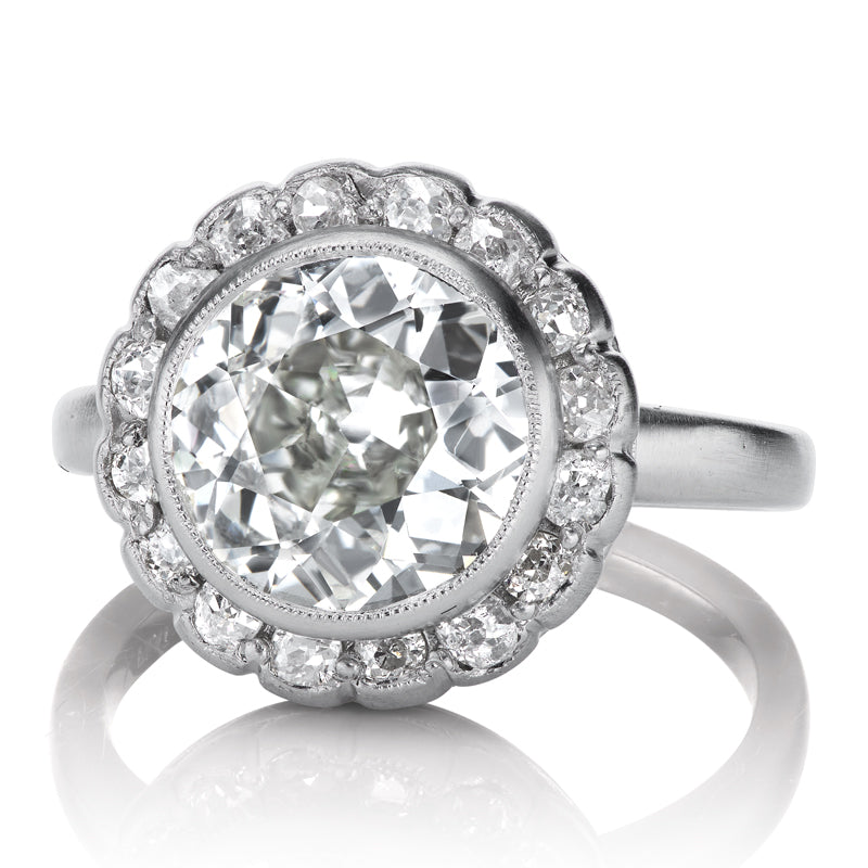 The Hyacinthe 2.86 ring is an AB original design made right here in NYC. The ring centers a GIA-certified 2.86 carat Old European Cut diamond of J color, VS2 clarity. Surround the center stone is a halo of 16 old cut diamonds of I-J color, VS-SI clarity. The halo of stones combine for an approximate total of 0.80 carats. The stones are set in a Platinum bezel setting. The ring is currently a hair over a size 6 and can be resized!