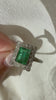 This one-of-a-kind antique piece features a breathtaking green emerald framed by a halo of bright white antique diamonds, all set in smooth platinum that beautifully unifies the design. A timeless piece!