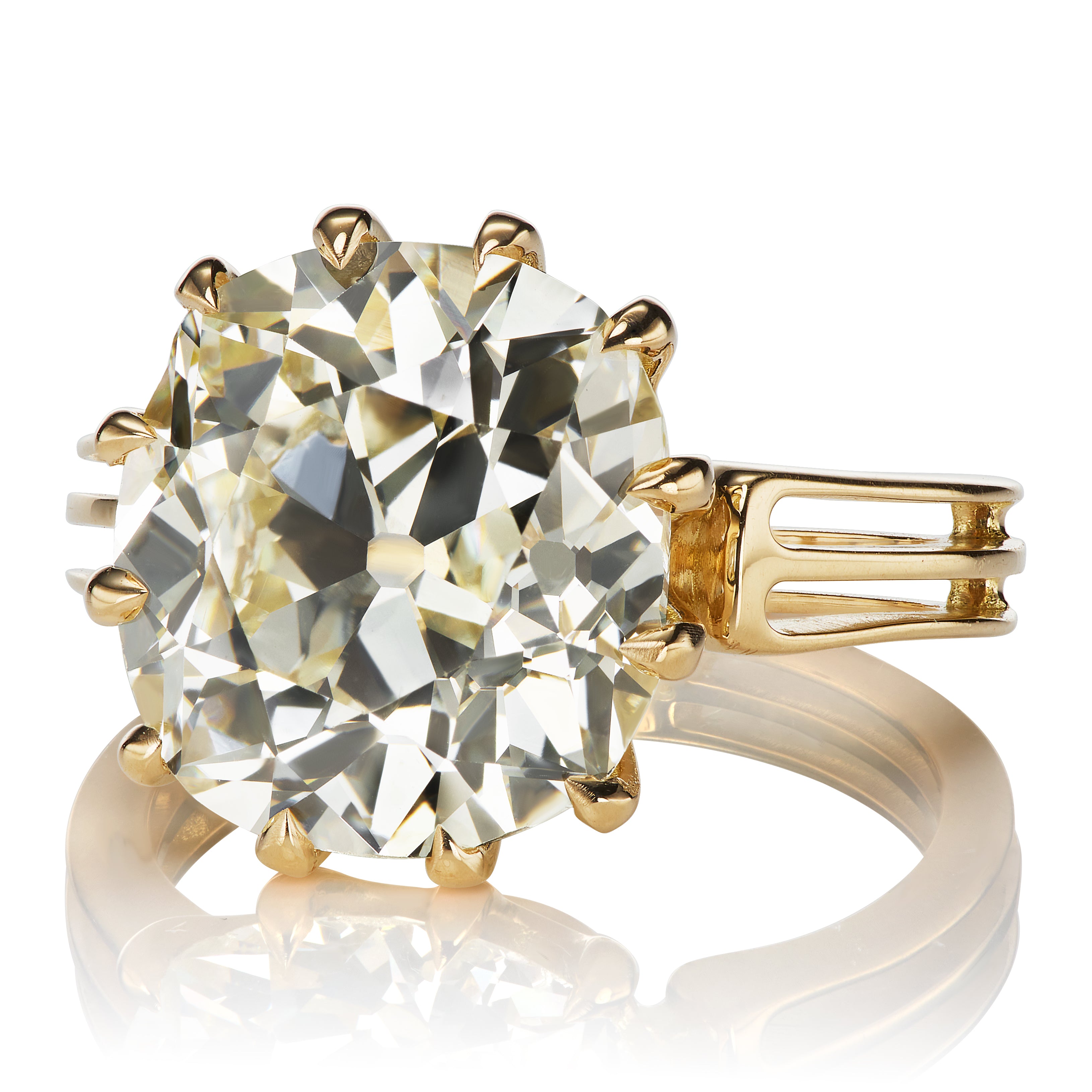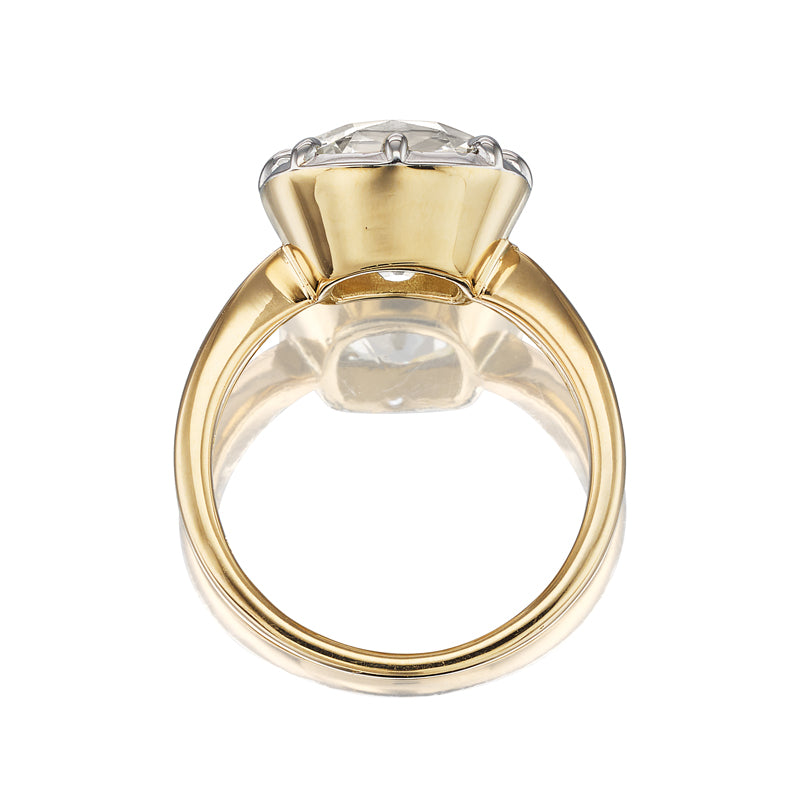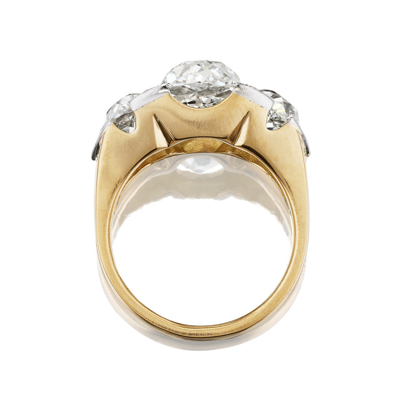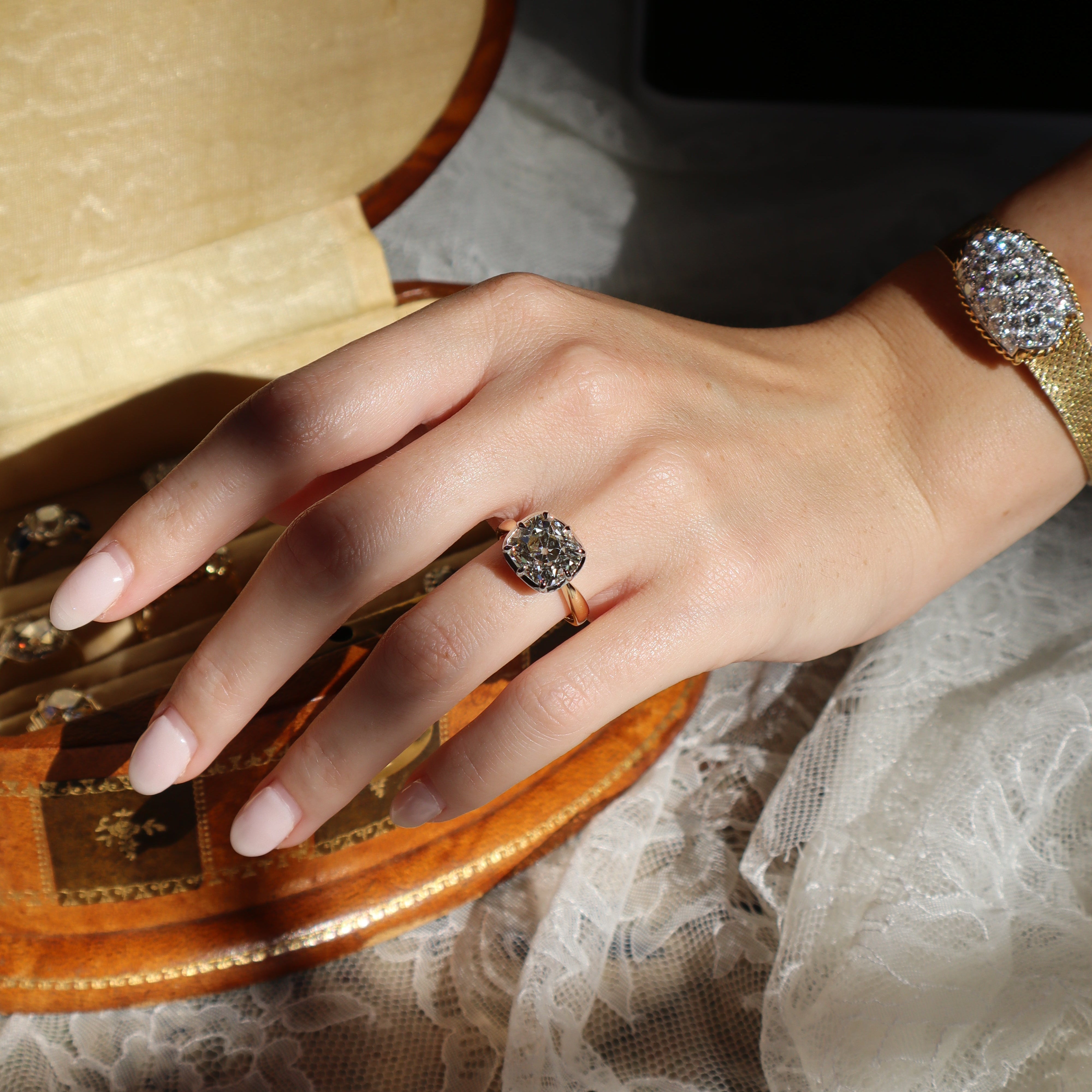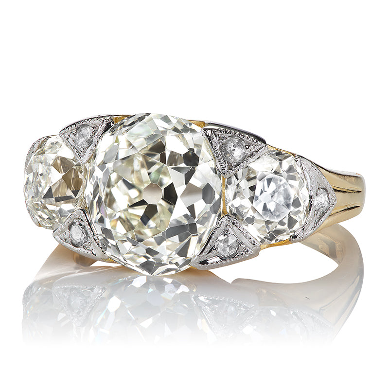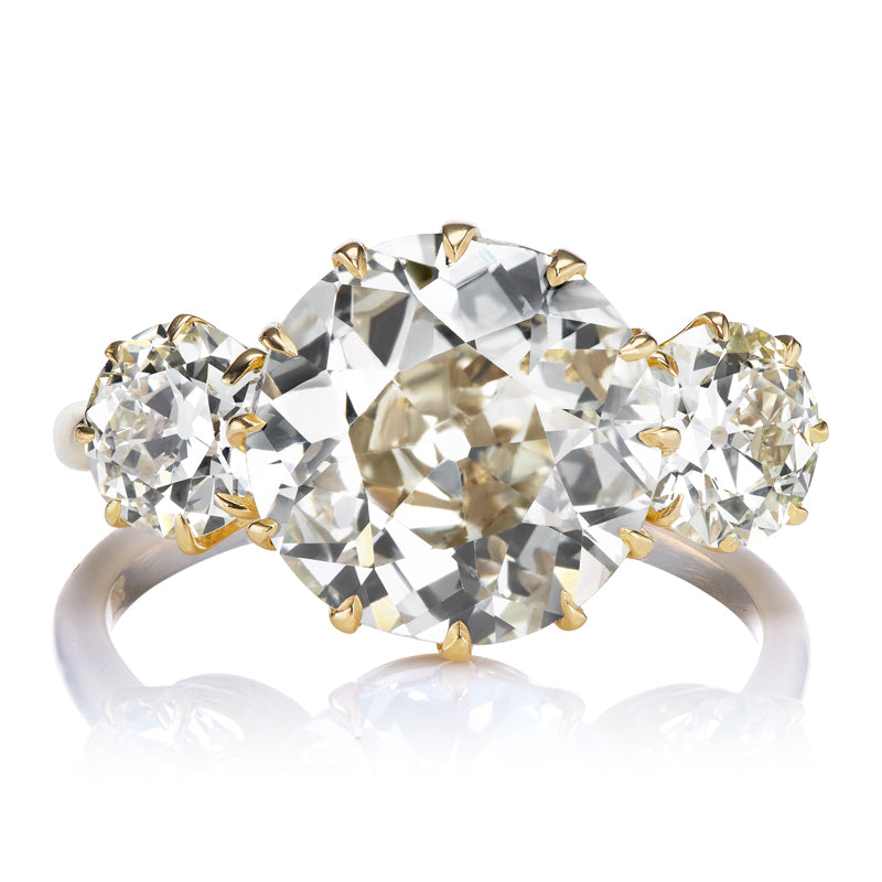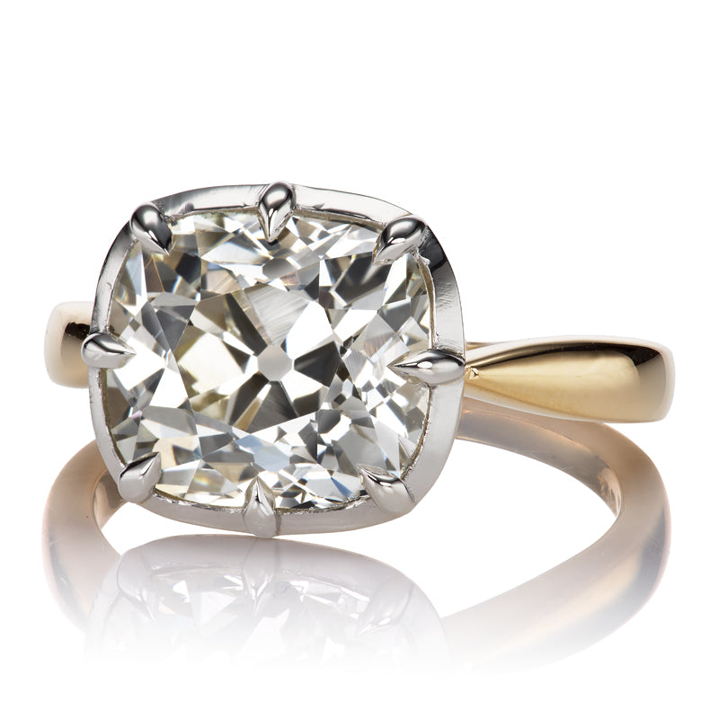 The two main antique diamonds are the old European cut and the old mine cut diamonds. To put it simply, old European cut is the antique version of the modern round brilliant cut diamond and the old mine cut is the antique version of the cushion cut diamond. These are the main cuts of diamonds that are seen throughout antique jewelry and that we use in the rings that we make here in New York City.