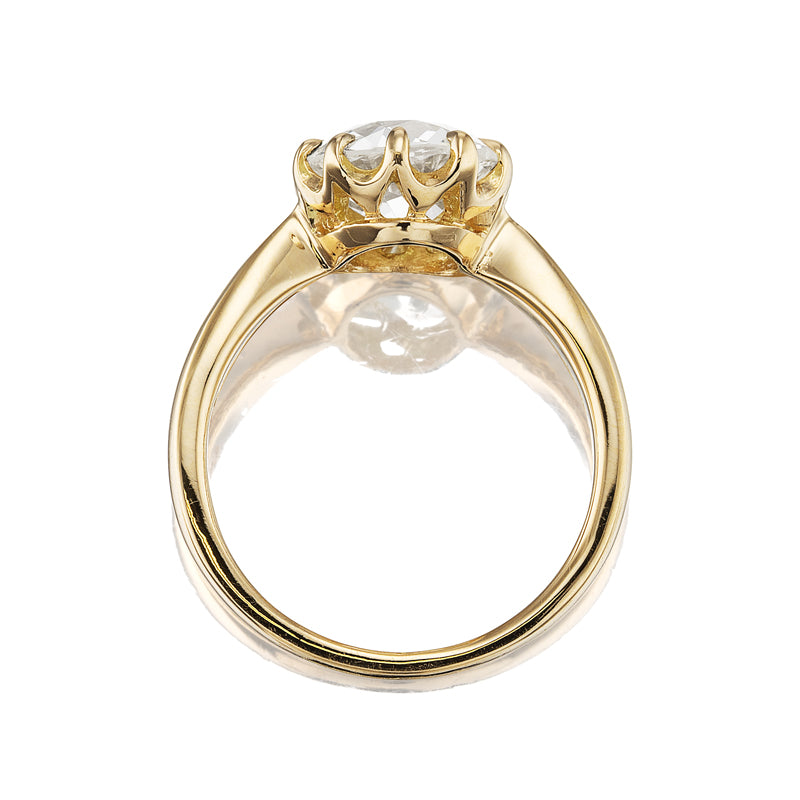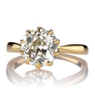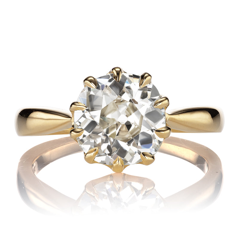 The Julian 2.35 ring is an AB original design. The ring centers a GIA-certified 2.35 carat Old Mine Cut diamond of O-P color, VS2 clarity. The stone is set in an 18kt Yellow Gold prong setting with a band tapering in towards the center stone. The ring is currently size 5.75 and can be resized!