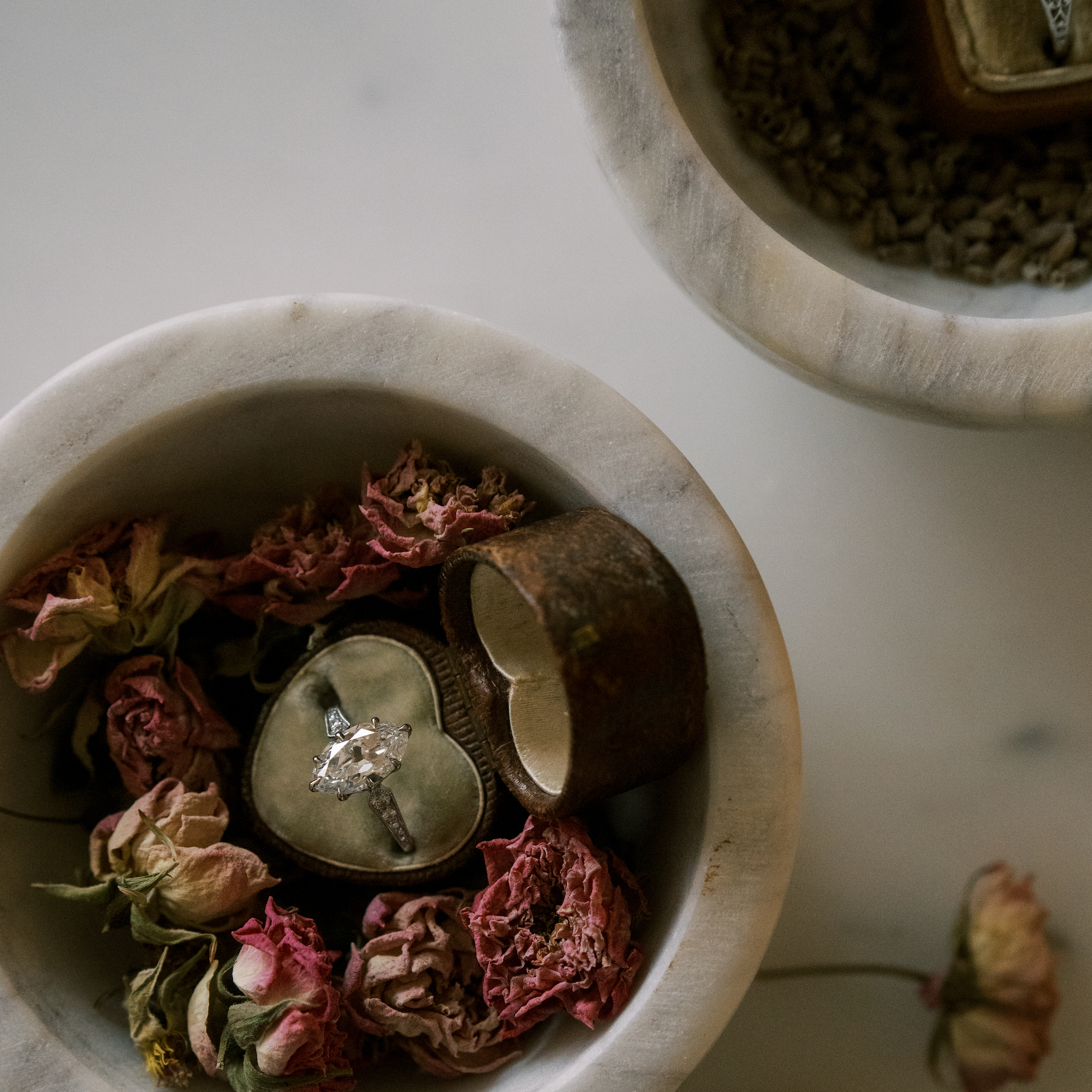 Perfect for anyone seeking an alternative to the traditional brilliant round diamond, the marquise is a unique elliptical cut with pointed ends. Popular among French nobility and really shooting to popularity during the Art Deco Era, this shape has endlessly charming vintage style (and is definitely a AB fave)! Paired with halos, baguettes, and other side stone arrangements, our hand-picked collection of vintage marquise diamond engagement rings offers a stunning variety!