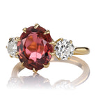 The Mallory 3.26 ring is an AB original design. The ring centers a GIA-certified 3.26 carat Purplish-Pink Oval Cut Tourmaline. To each side of the center stone is one Old European Cut Diamond, both combining for 0.99 carats of I-J color and VS-SI clarity. The three stones are set in our signature 18kt Yellow Gold prong setting. The ring is currently size 5.75 and can be resized!