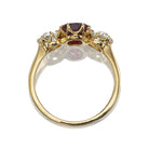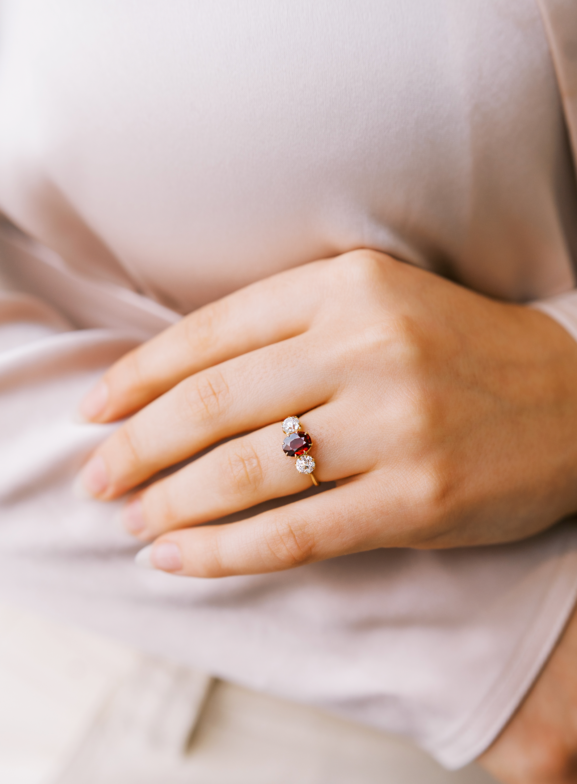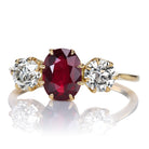 This richly hued red ruby is perfectly complemented by two shimmering side stones. These stones are set low to the finger and the ring plays nicely with wedding bands.