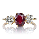 The Mallory 1.26 ring is an AB original design made right here in NYC. The ring centers a GIA-certified 1.26-carat Oval Cut No-Heat Mozambique ruby. An Old European Cut diamond is set to either side of the center stone, both combining for 0.80 carats of approximately I-J color, VS-SI clarity. The stones are set in an 8 prong 18kt yellow gold setting. The ring is currently size 5.75 and can be resized!