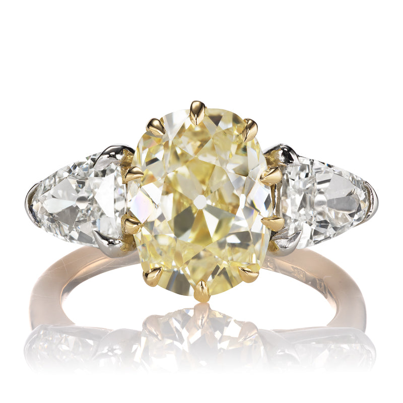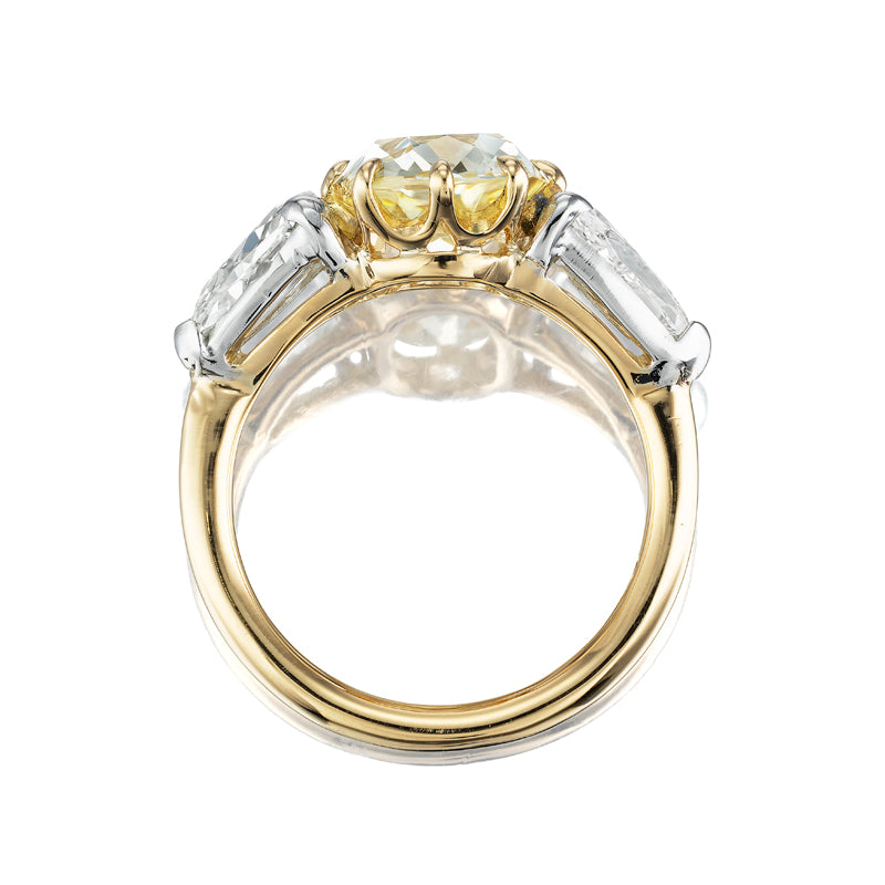 The Celeste ring is an AB original design. The ring centers a GIA-certified 3.67-carat Old Mine Cut diamond of Fancy Light Yellow color, SI1 clarity. To either side of the center stone are two very rare, uniquely-shaped antique cut diamonds of F-G color, VS clarity, totaling approximately 1.20 carats. The stones are set in a two-tone 18kt Yellow Gold and Platinum setting. The ring is currently size 6 and can be resized to some sizes.