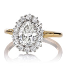 The Riley 1.05 ring is an AB original design. The ring centers a GIA-certified 1.05 carat Pear Shaped diamond of H color, SI1 clarity. Surrounding the center stone is a halo of Old European Cut diamonds, all combining for 0.49 carats of H-I color, VS-SI clarity. The stones are set in Platinum prongs atop 18kt Yellow Gold 18kt Yellow Gold with engraved details on the band. The ring is currently a size 5.75 and can be resized!