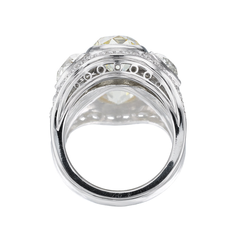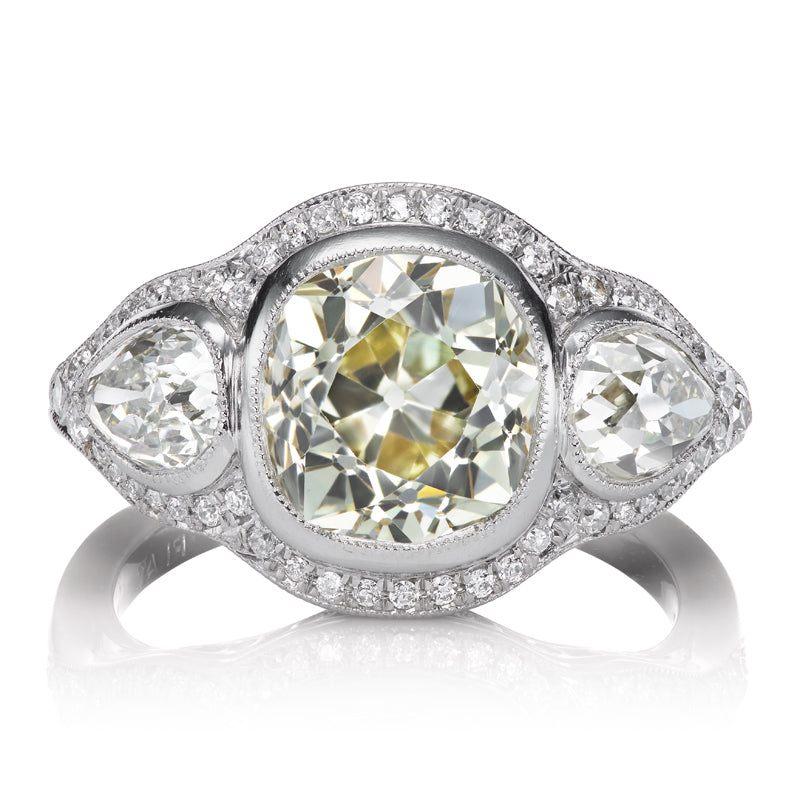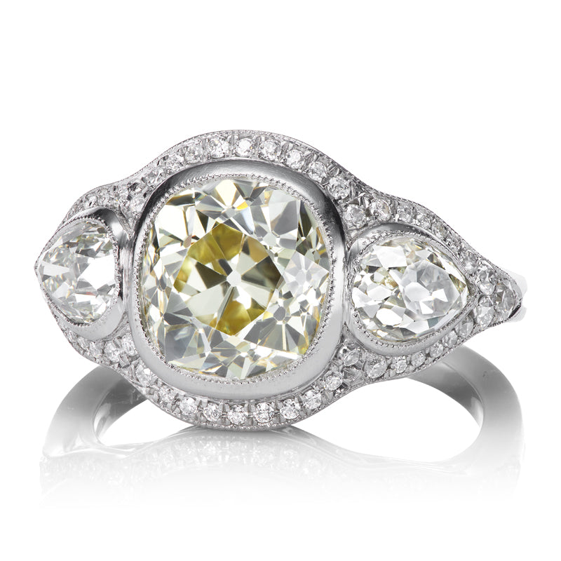 The Hera 3.01 ring is an AB original design made right here in NYC. The ring centers a GIA-certified 3.01 carat Old Mine Cut diamond of Fancy Light Yellow color, VS2 clarity. Set to each side of the center stone is one Pear Cut diamond of I-J color, VS-SI clarity. The side stones combine for an approximate total of 1.98 carats. The stones are set in a Platinum bezel setting with a halo of tiny diamonds outlining the face of the ring. The ring is currently size 6 and can be resized!