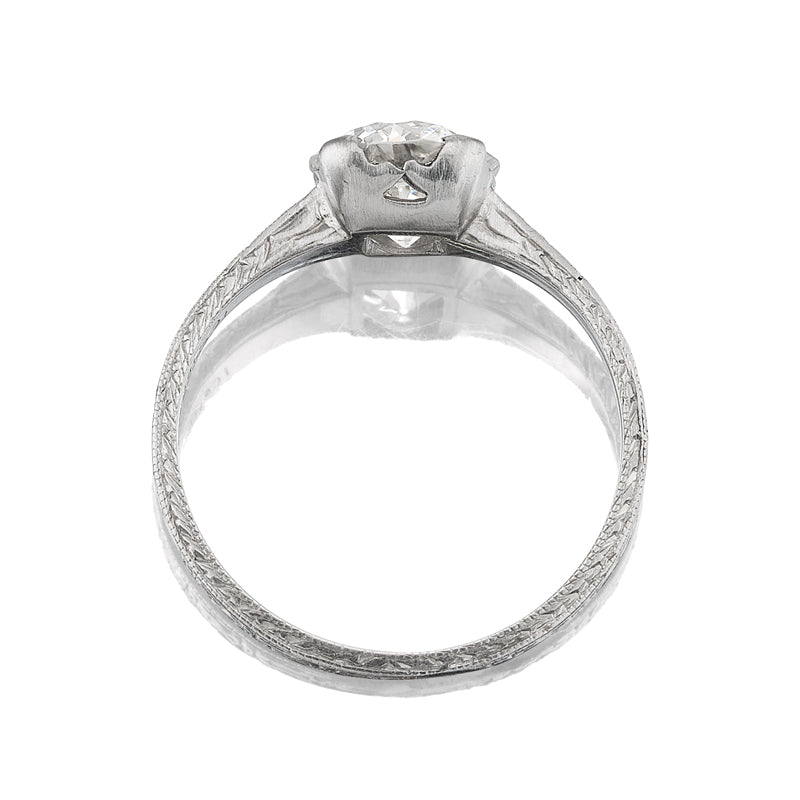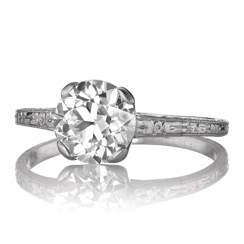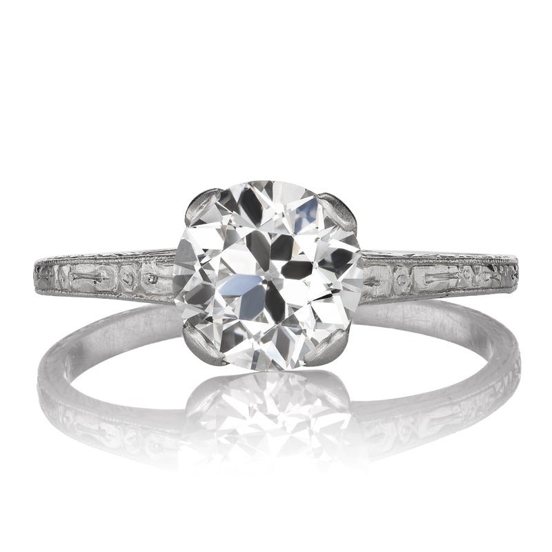 The Mary ring is a true vintage ring from the Edwardian Era, circa 1915. The ring centers a GIA-certified 1.51 carat Transitional Cut diamond of I color, SI1 clarity. The stone is set in a four-prong platinum setting set on a delicate platinum band with engravings. The ring is currently a size 5.75