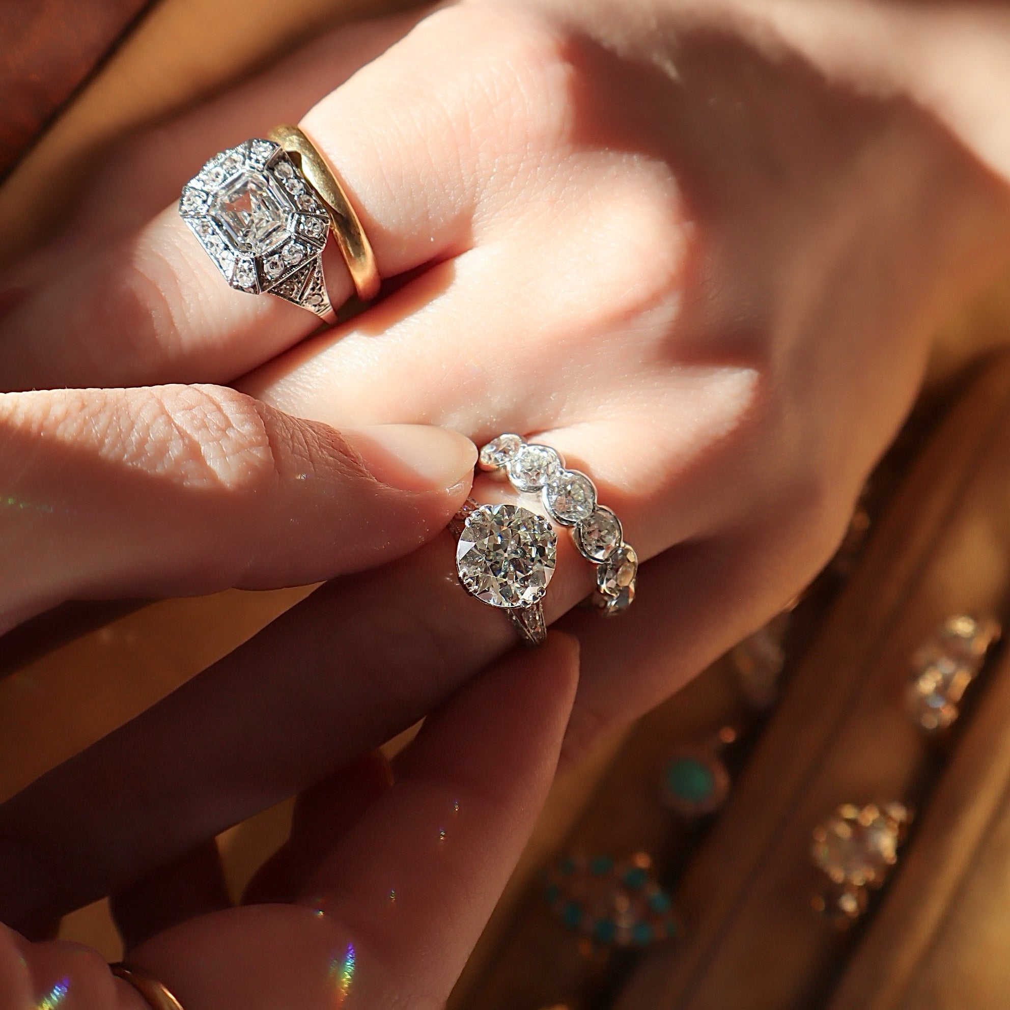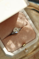 At AB, our love for antique rings is rooted in the level of detail in these pieces—and this one ring is a perfect example. The closer you look, the more you see the careful craftsmanship from the leaf-like filigree in the basket to the smoothly swooping shoulders. The centerpiece is a bright transitional cut diamond, full of life and incredibly luminous with the "checkerboard" faceting we love to see.