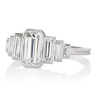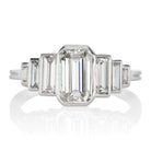 • Bezel-set center stone with three vertical baguettes to either side that taper in size.