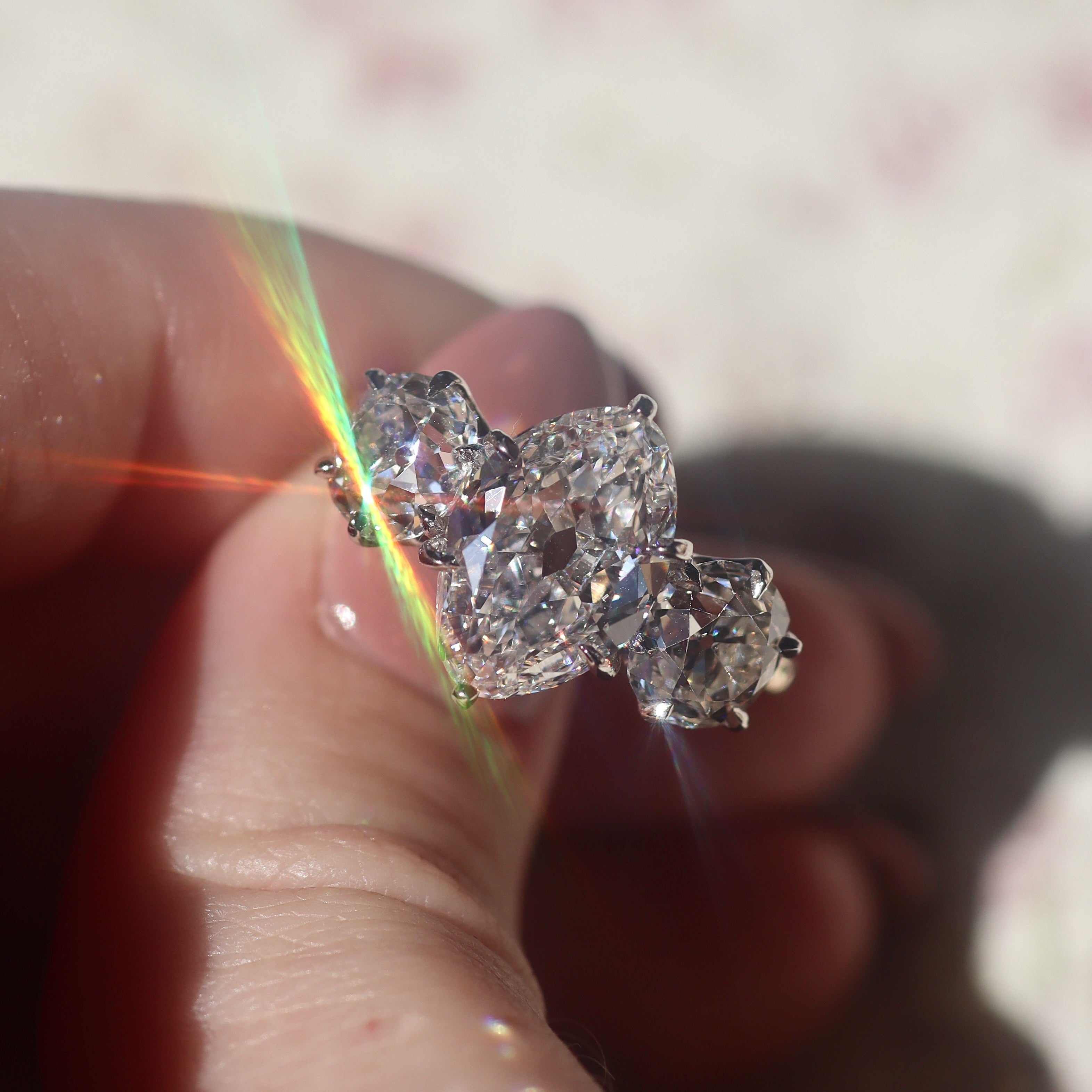 The Marielle 3.01 ring is an AB original design made right here in NYC. The ring centers a GIA-certified 3.01-carat Oval/Moval cut diamond of F color, VVS1 clarity. To one side of the center stone is a GIA-certified 1.18-carat old mine cut diamond of G color, VS2 clarity and to the other side is a GIA-certified 1.12-carat old mine cut diamond of H color, VS1 clarity. The stones are each set in 6-prong platinum basket on an 18kt yellow gold setting. The ring is currently size 5.75 and can be resized!