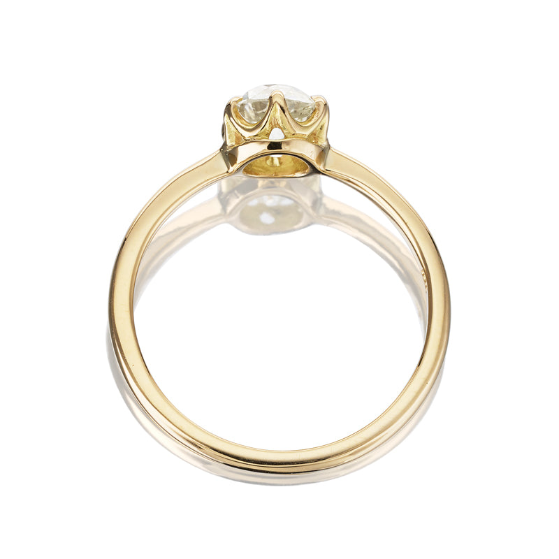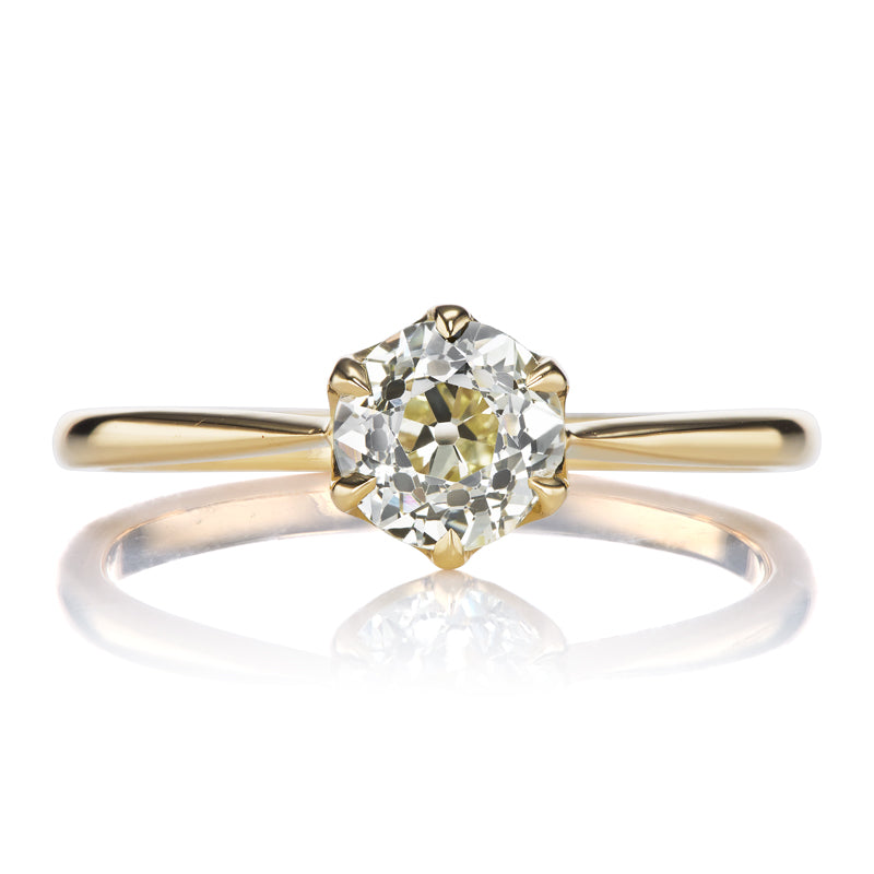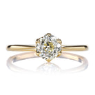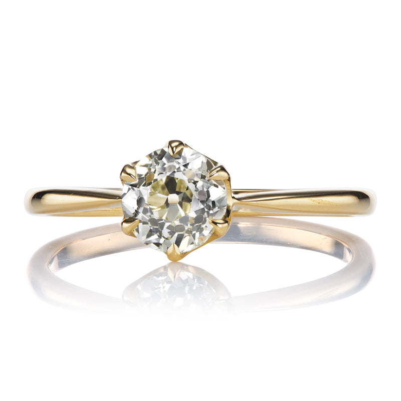 The Bea 0.79 ring is an AB original design made right here in NYC. The ring centers a GIA-certified 0.79 carat Old European Cut diamond of Q-R color, SI2 clarity. The stone is set in an 18kt Yellow Gold 6-Prong setting. The ring is currently size 6 and can be resized!