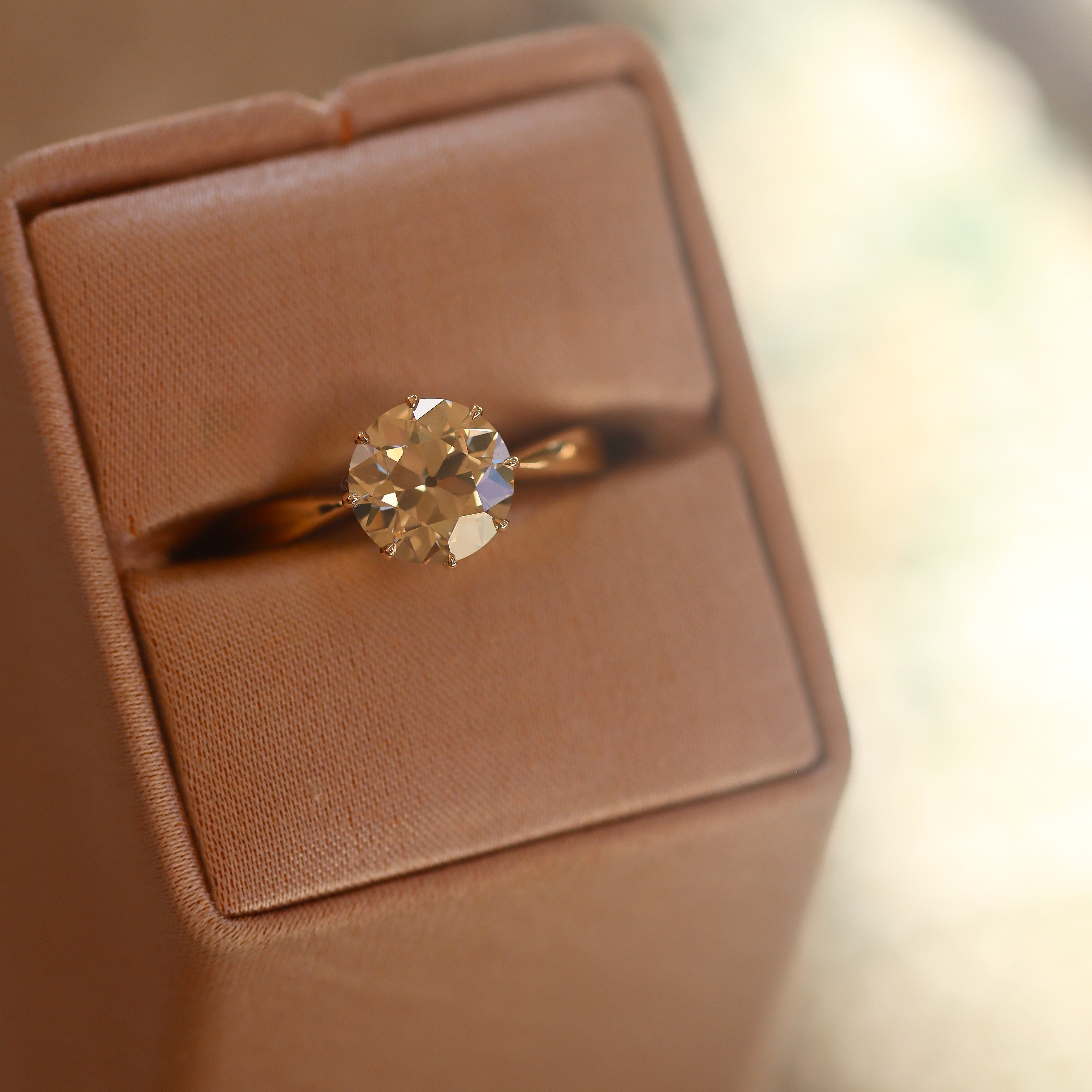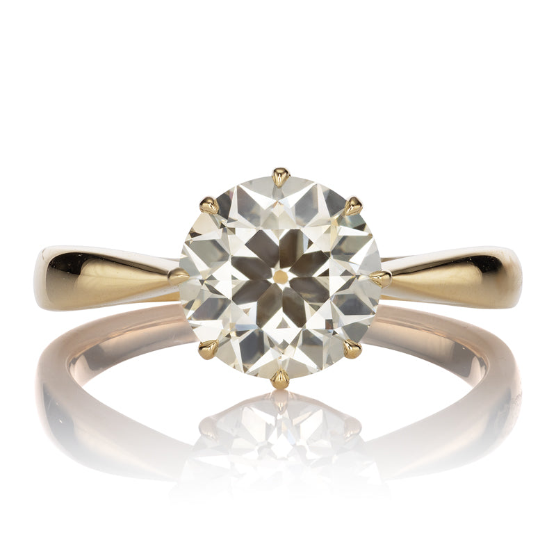 A classic Old European Cut diamond is held by our beautiful multi-prong golden setting on a comfortable and refined tapered band. This diamond has bright, even kaleidoscopic faceting and warm, cozy taupe tones.
