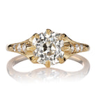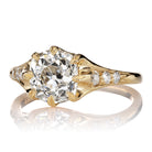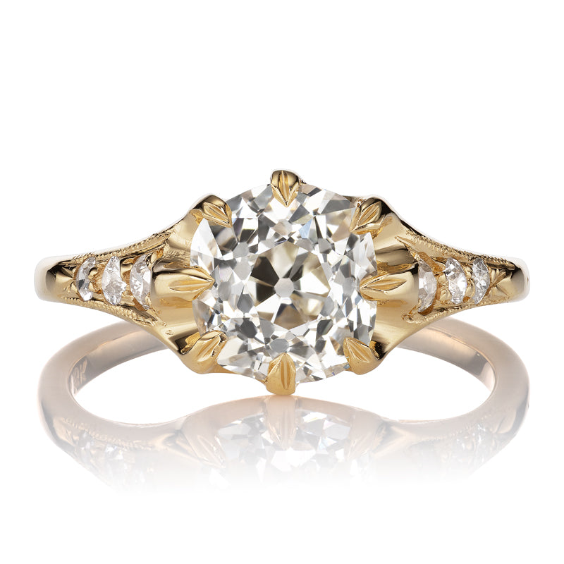 The Cherry 2.08 ring is an AB original design. The ring centers a GIA-certified 2.08-carat Old Mine Cut diamond of K color, SI2 clarity. The stone is set in an 18kt Yellow Gold 8-prong setting with three Old Cut side stones set into each shoulder. The sides stones are of similar color and clarity and total 0.20 carats. The ring is currently size 6.25 and can be resized!