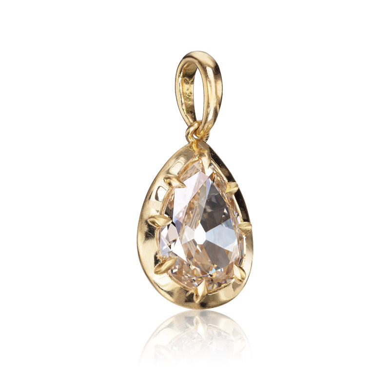 The Lulu Pendant 3.11 is an AB original. The pendant features a GIA-Certified 2.43 carat Pear Cut diamond of M color, Faint Brown color (read: champagne) SI2 clarity. The diamond is collet-set in an 18kt Yellow Gold setting with an 18kt gold bail. The Pendant comes on our Classic 18-inch 18kt yellow gold chain.
