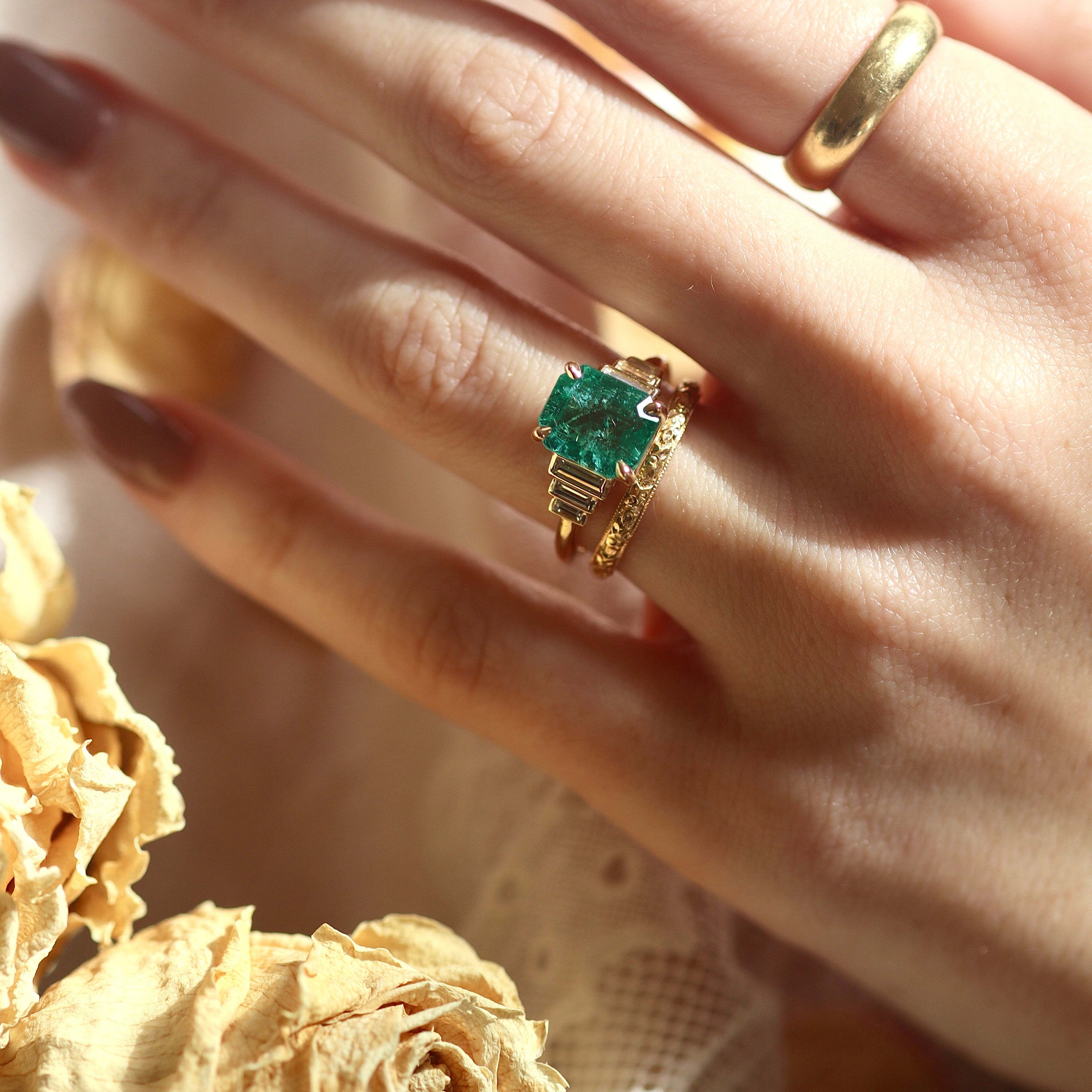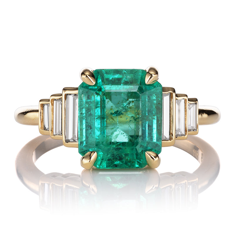 Bold and beautiful, this rendition of our Camille ring features a sizable and beautifully hued Zambian emerald. This glowing stone has organic inclusions throughout that add a marbled look, reminiscent of ripples across its unique blue-green depths. A staircase of baguettes descending from the center stone add just the right hint of Art Deco inspiration and a lovely flow on the finger.