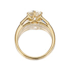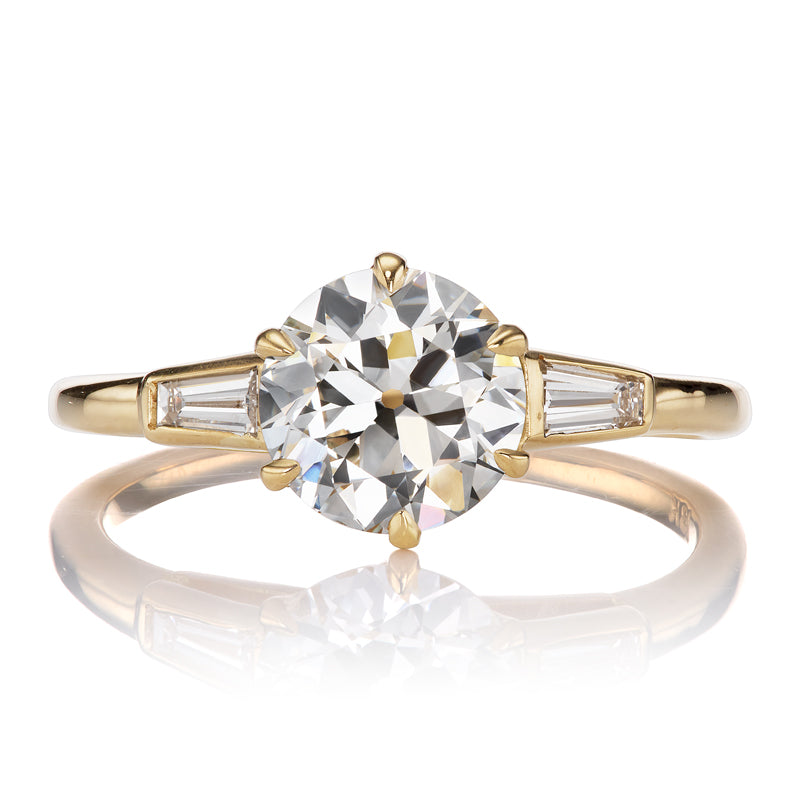 The Cynthia 1.52 ring is an AB original design. The ring centers a GIA certified 1.52-carat Transitional Cut diamond of J color, VS2 clarity. The stone is set in a six-prong 18kt yellow gold setting with a tapered baguette bezel-set to either side. The ring is currently size 6 and can be resized!