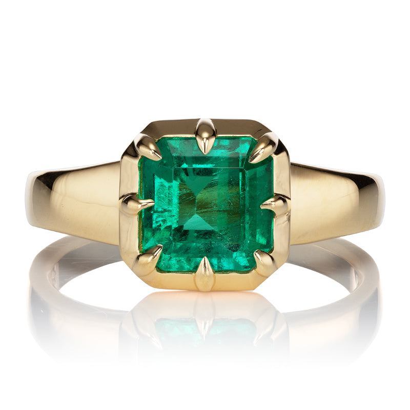 The Allie 1.43 ring is an AB original design. The ring centers a C Dunaigre certified 1.43 carat octagonal-cut Colombian emerald with minor enhancement. The stone is collet-set in an 18kt Yellow Gold setting on a thick tapered band. The ring is currently size 6 and can be resized!