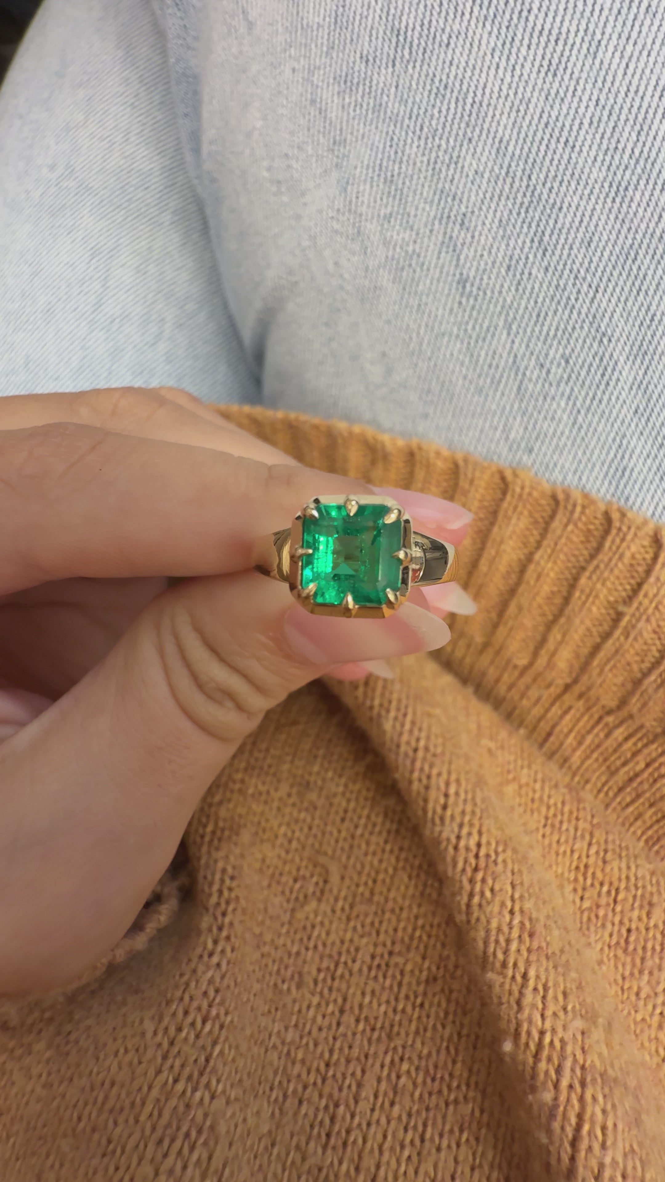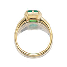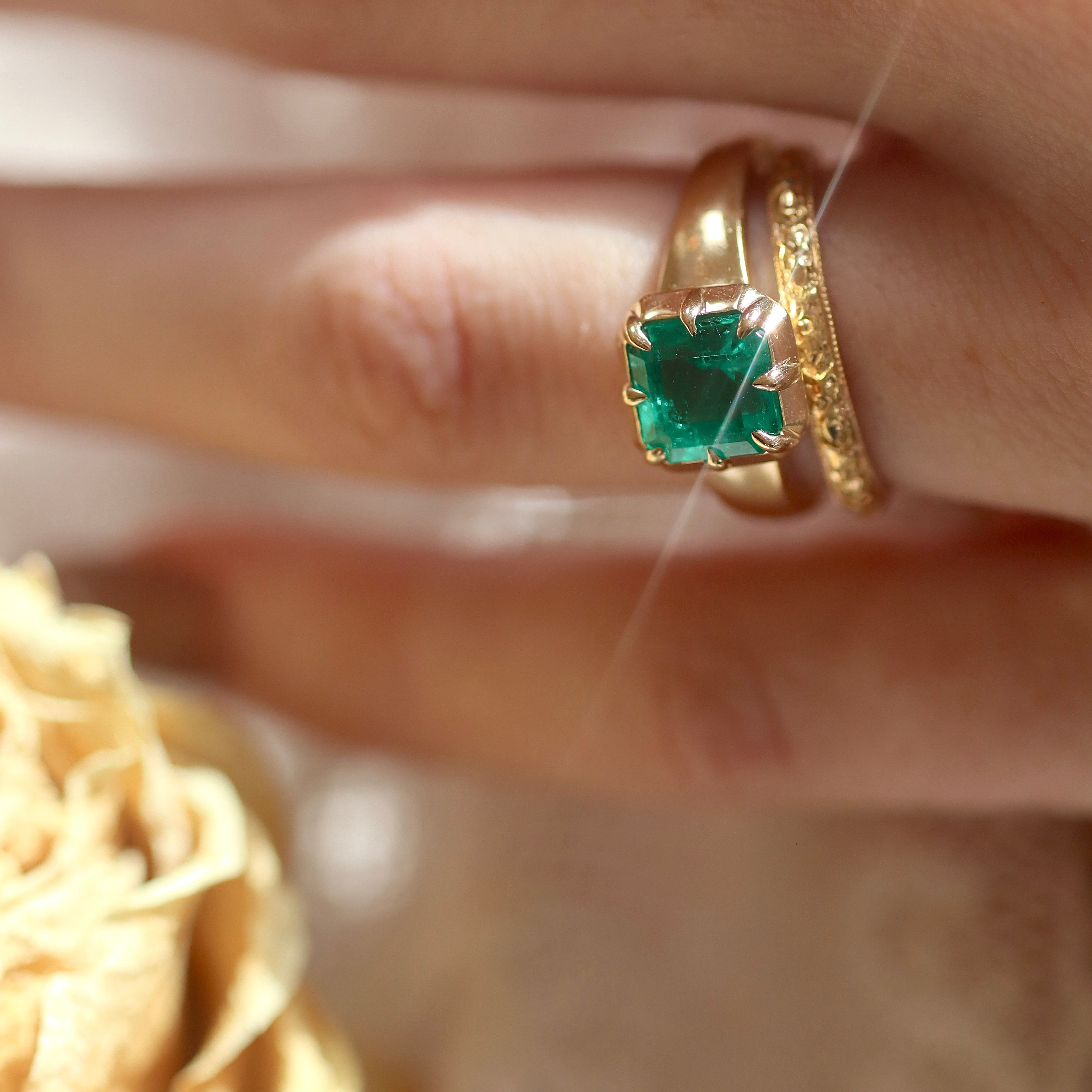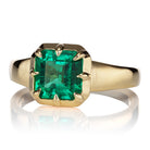 One of our favorite setting styles that borrows from Georgian-era design, this glowing emerald is nestled in a buttery yellow gold collet setting. We love this setting for its nod to the Old World, chunky 18kt gold band, and easy low-profile- a beautiful choice as an engagement ring or birthstone ring.