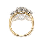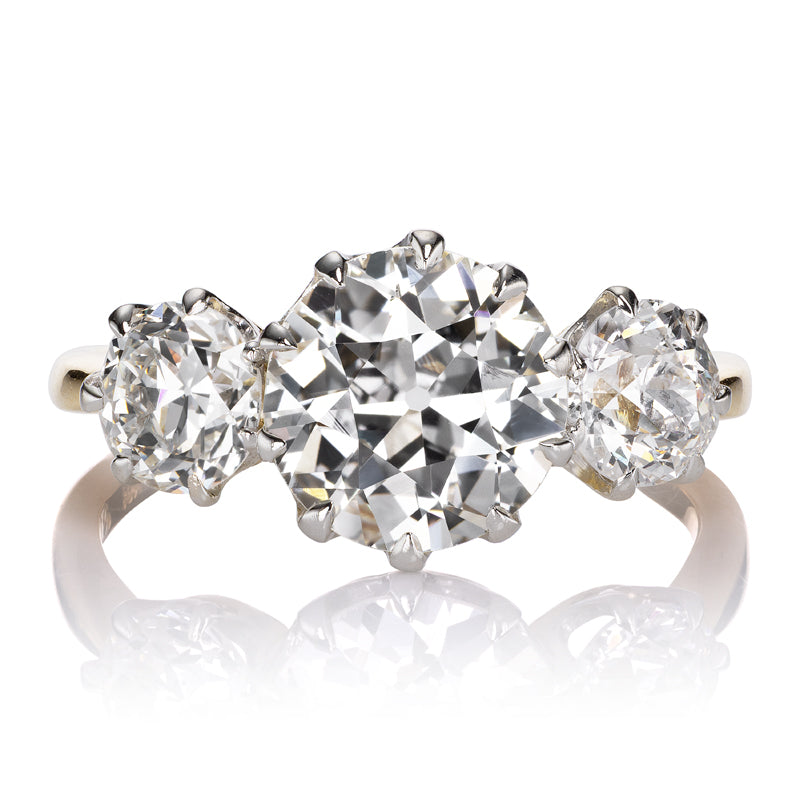 The Marielle ring is an AB original design. The ring centers a GIA-certified 2.06-carat Old European Cut diamond of J color, VS1 clarity. To each side of the center stone is an Old European Cut diamond of coordinating color and clarity, totaling 1.17 carats. The stones are set in a two-tone Platinum and 18k gold setting. The ring is currently size 6.25 and can be resized!