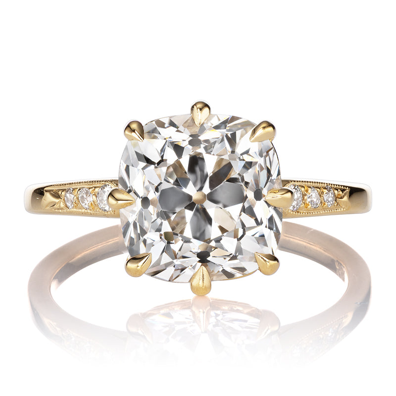 Our Verona ring exudes such romance with its Fleur-de-Lys basket, petite side stones, and delicately tapered shoulder. Centering a sizable hand-cut Old Mine Cut diamond in a bright near-colorless hue- true antique stone that captures all the things we love about antique diamonds. This ring offers timeless feminine, beauty and wonderful finger-flattering coverage.