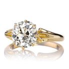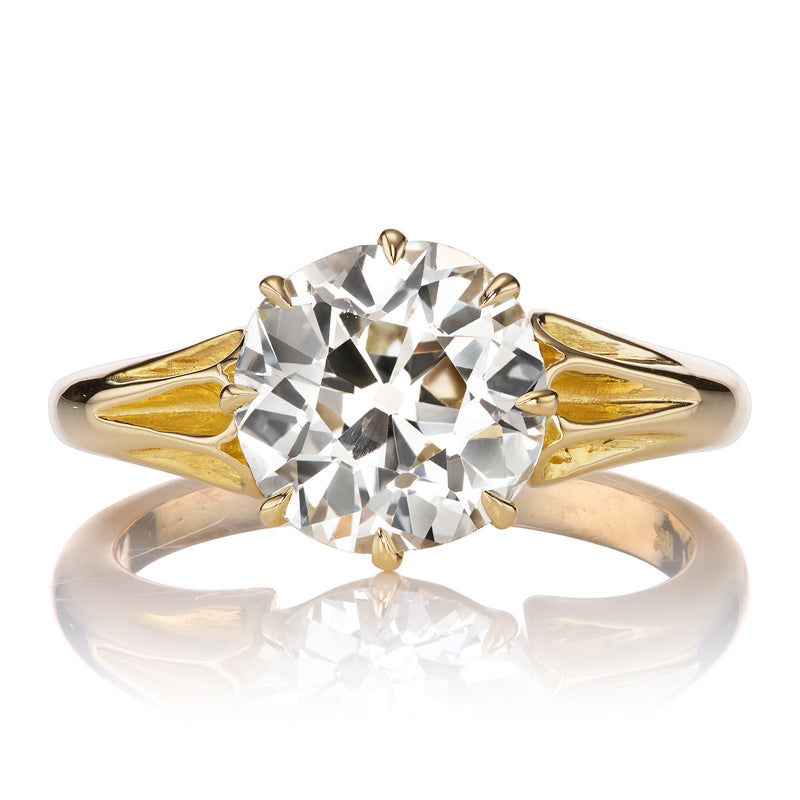The Lorena 2.22 ring is an AB original design. The ring centers a GIA-certified 2.22 carat Old European Cut diamond of N color, SI1 clarity. The stone is set in 8 prongs on an 18kt Yellow Gold band with beautifully fluted shoulder detailing. The ring is currently size 4.25 and can be resized!