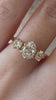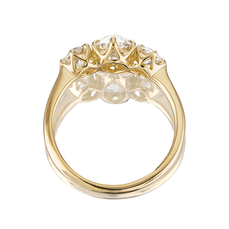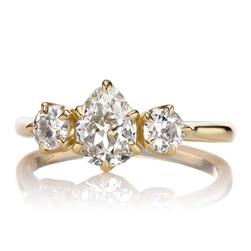 This three-stone ring is a shimmering beauty. We are always charmed by antique pears, and this one is no exception. With a bright color and lovely, unique shape, the center diamond is surrounded by two Old European Cut stones that add lovely finger-span to the piece. We love her stacked with a variety of wedding bands for a look all your own.