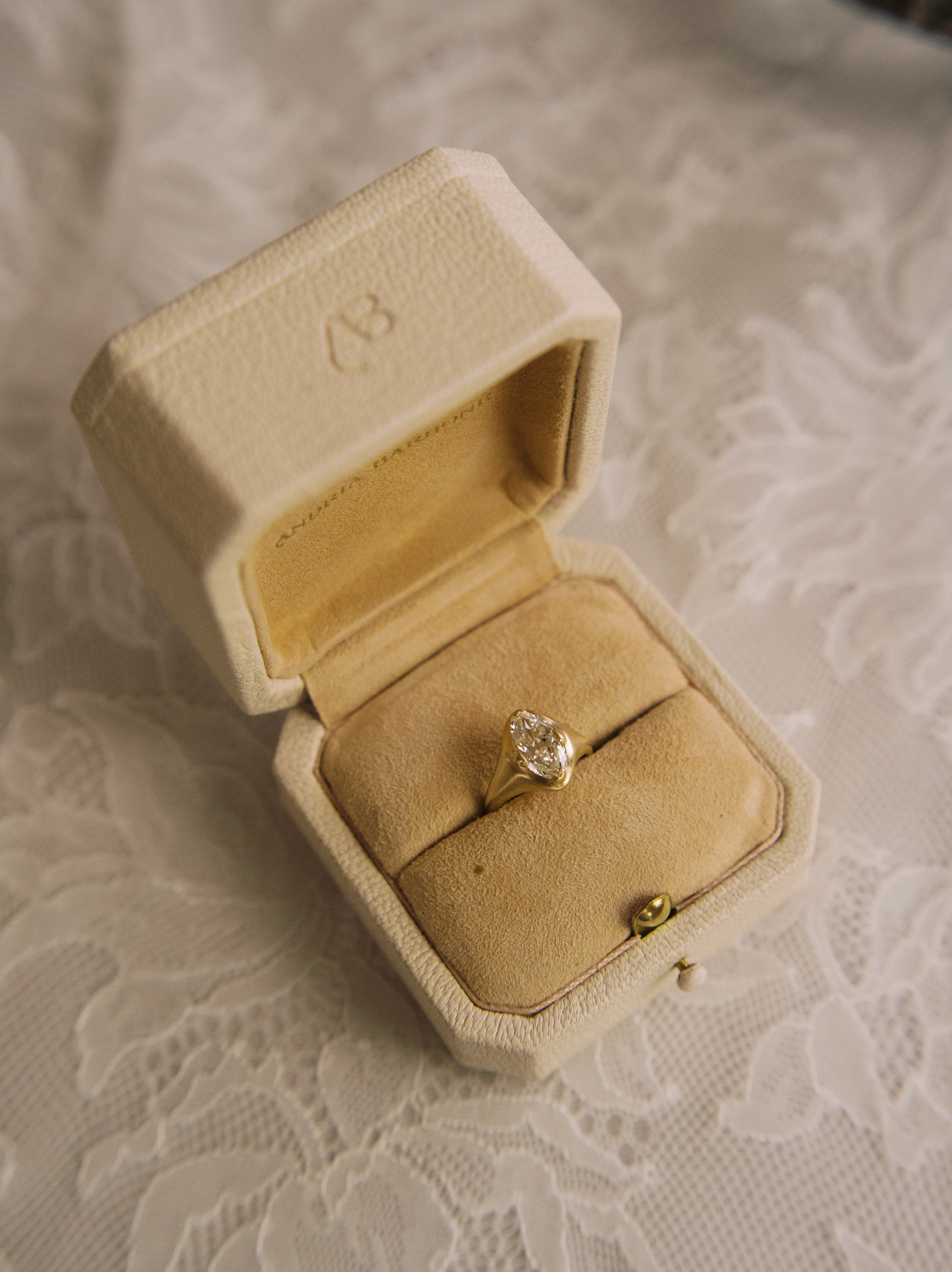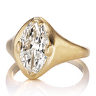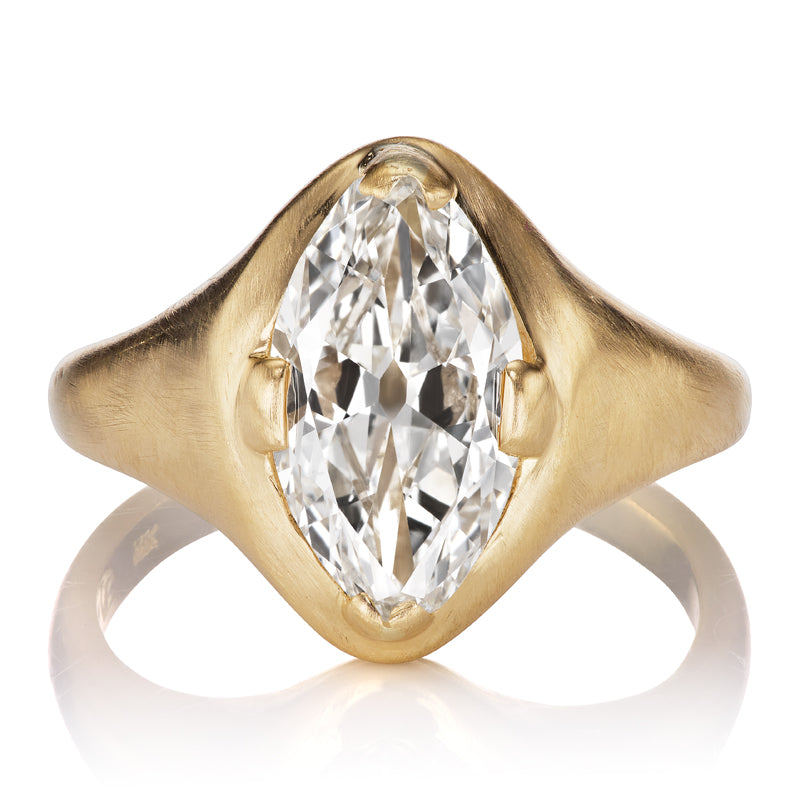 A wonderful version of our beloved Gadot ring-- this time centering a bright, spready antique moval diamond. A Moval is a beautiful combination of a marquise diamond and oval diamond that results in a lovely, soft shape. The elongated shape of the diamond is hugged by warm, buttery gold in this sinuously curving, finger-wrapping setting.