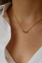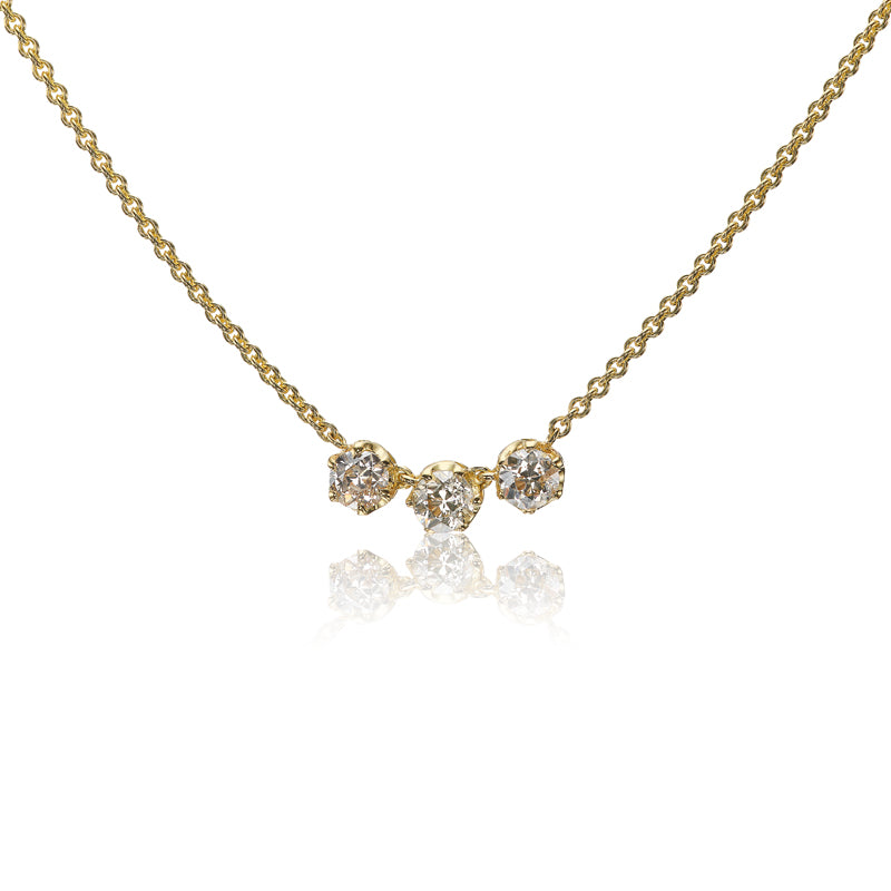 The Debbie Necklace 1.32 is an AB original. The necklace features three Old European Cut diamonds of Light Brown color (read: champagne), VS-SI clarity. The 3 stones combine for a total of 1.32 carats. The diamonds are prong-set side by side on an 18kt yellow gold chain.