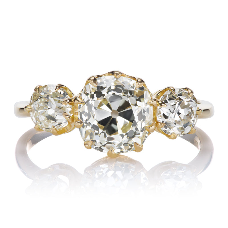 The Marielle ring is an AB original design. The ring centers a GIA-certified 2.30 carat Old Mine Cut diamond of S-T color, VS2 clarity. To each side of the center stone is an Old Mine Cut diamond, both totaling 0.77 carats of M-N color and SI clarity. The stones are set in an 18kt yellow gold setting. The ring is currently size 7.25 and can be resized!