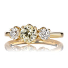 The Marielle ring is an AB original design. The ring centers a GIA-certified 0.71 carat Transitional Cut diamond of S-T color, VS2 clarity. To each side of the center stone is an Old European Cut diamond, both totaling 0.48 carats of approximately H-I color, SI-I clarity. The stones are set in an 18kt yellow gold setting. The ring is currently size 5.75 and can be resized!
