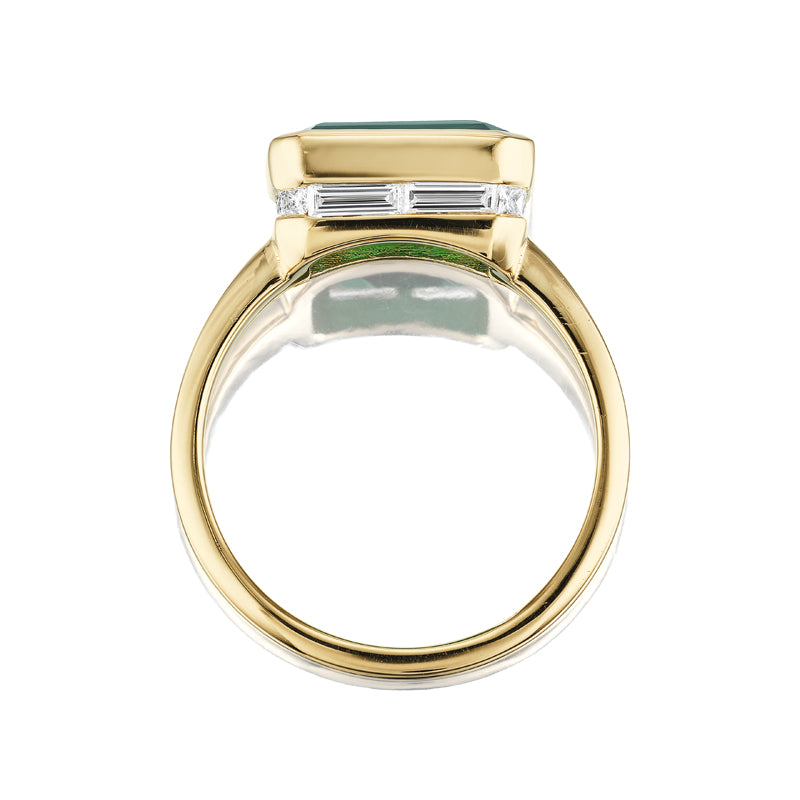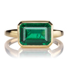 A truly unique ring with a surprising twist, this version of our Adina ring features a vibrant nearly 3 carat emerald. We set her with a hidden halo of baguette-cut diamonds to add a chic secret to a breathtaking piece. Adina's shape feels simultaneously deco-inspired and modern, creating a vivid statement piece.