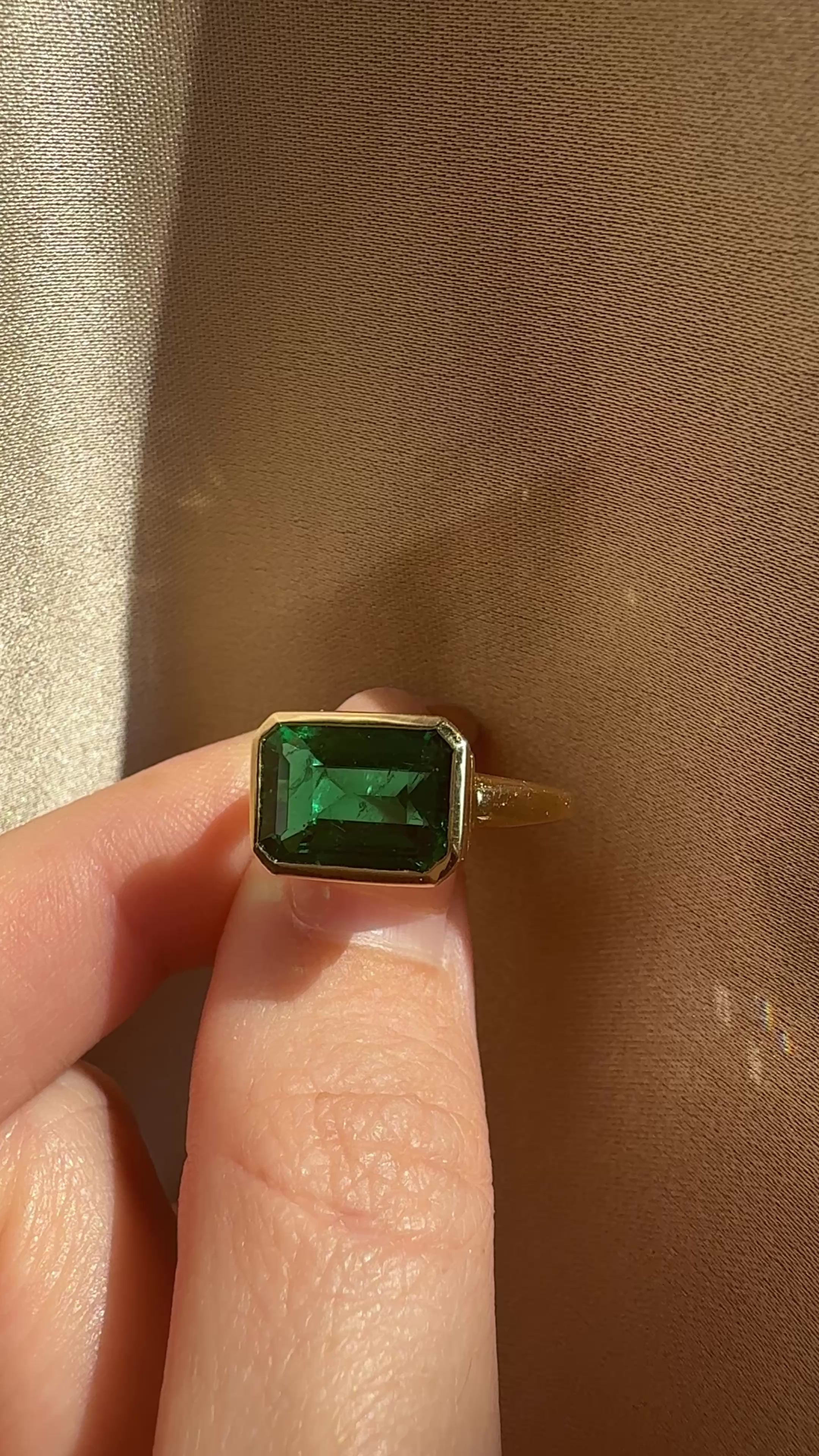 The Adina ring is an AB original design. The ring centers a C. Dunaigre-certified 2.80-carat Emerald-cut Zambian Emerald of Minor Clarity Enhancement, set East-West in a golden bezel. Encircling the basket of the emerald is a hidden halo of baguette diamonds. The stones are set in an 18kt yellow gold bezel setting. The ring is currently size 5.75 and can be resized!