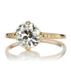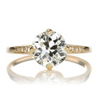 The Rosaria 1.74 ring is an AB original design. The ring centers a GIA-certified 1.74 Old European Cut diamond of L color, VS1 clarity. The stone is 4-prong set in an 18kt Yellow Gold setting with 3 tiny OEC diamonds set in each shoulder of the ring. The ring is currently size 6 and can be resized!