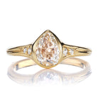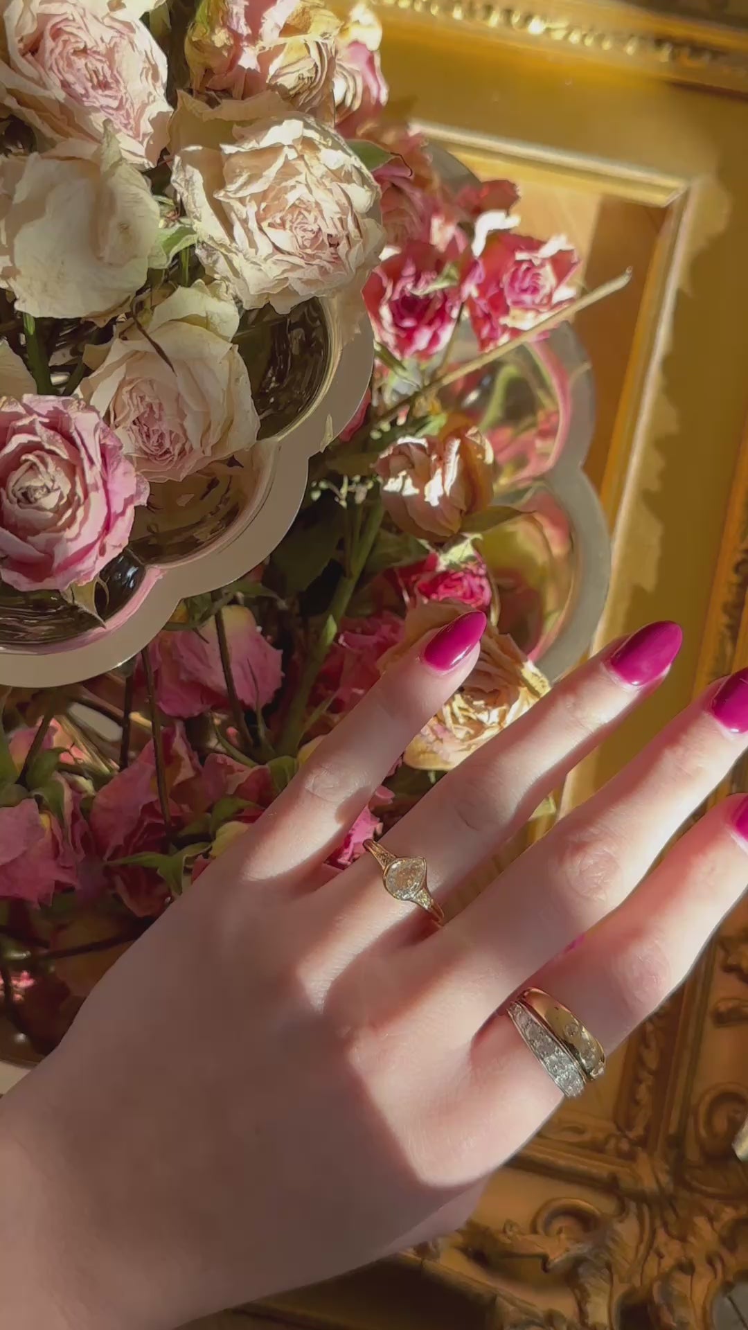 The Rosita 0.72 ring is an AB original design made right here in NYC. The ring centers a GIA-certified 0.72 carat Pear Cut diamond of K color, I1 clarity. The stone is bezel set in an 18kt Yellow Gold setting with two small Old Cut diamonds set on each shoulder. The ring is currently size 6 and can be resized!