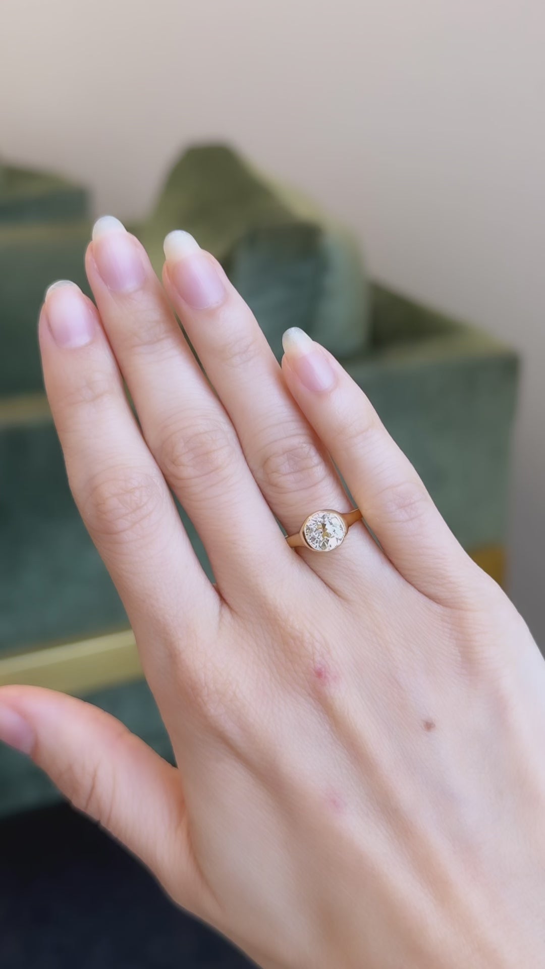 Luxuriously smooth 18kt yellow gold ensconces this fiery Old European Cut diamond for a playful and unique ring. Light millegraining around the stone adds just the right touch of character. The perfect ring for those looking for something unique yet unmistakably an engagement ring. And a beautiful one, at that!