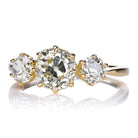 The hue of these diamonds is divine. The lightest touch of warmth makes for a romantic and historic look. These three beautiful antique diamonds create a finger-spanning, low-profile dream of a ring.
