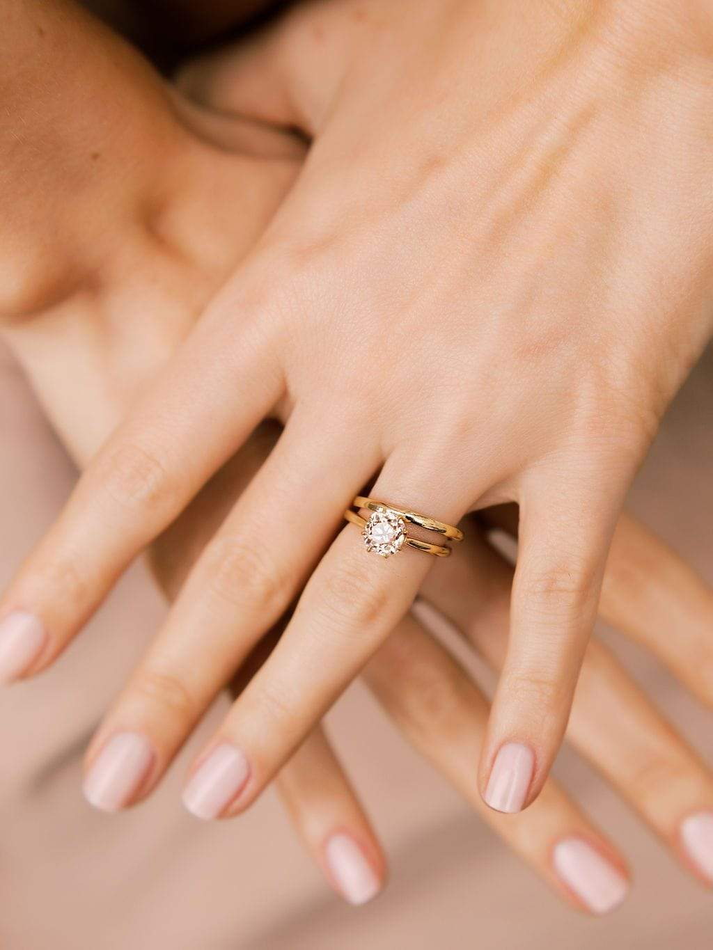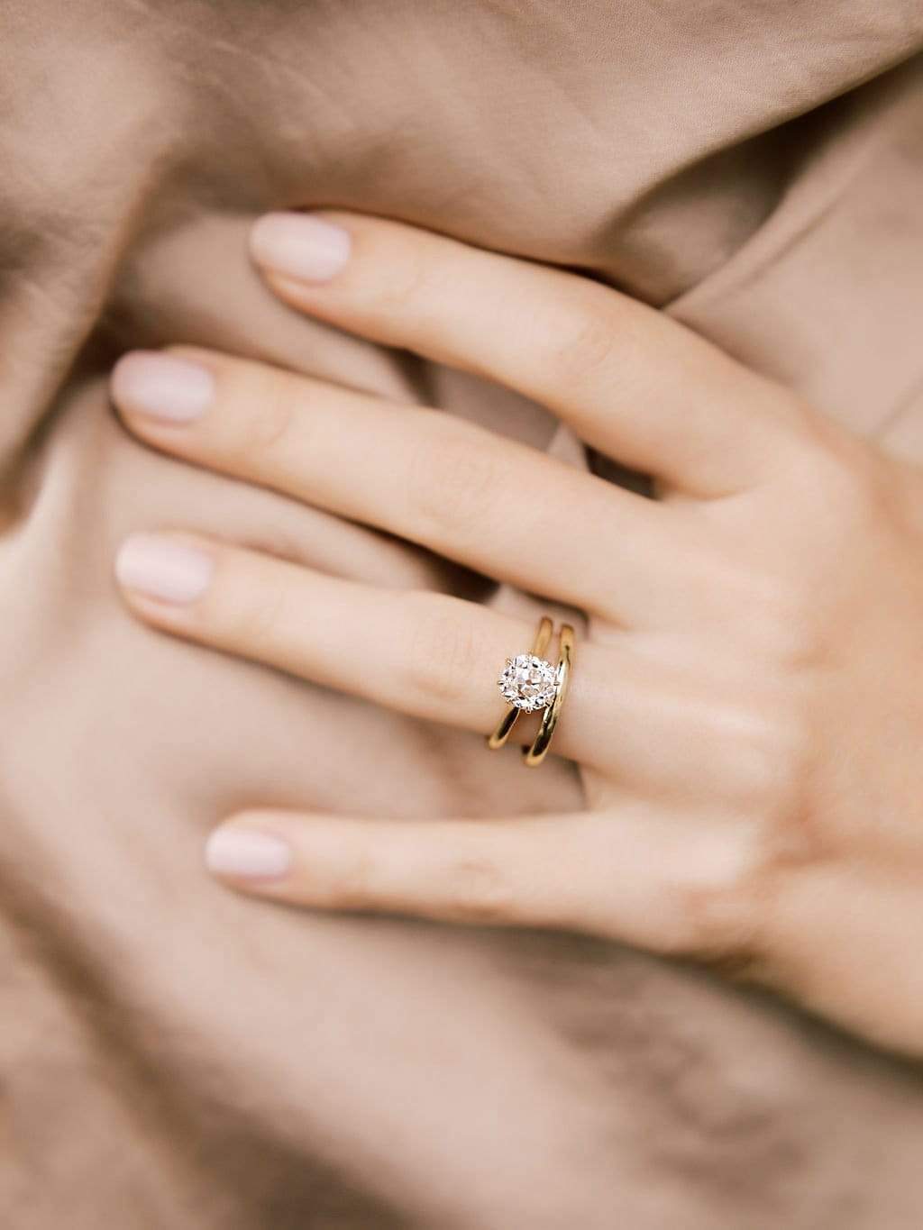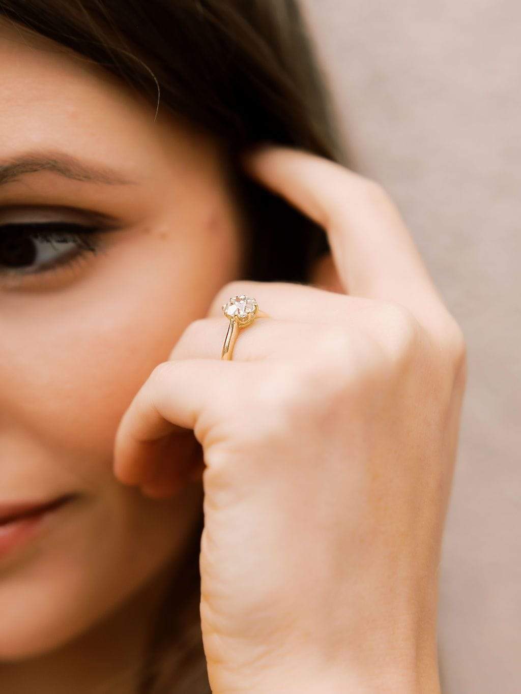 The Claire style is a new design for us that is a bit thicker than our Bella style but doesn't feel too chunky. We chose a gorgeous old mine cut diamond to center this beautifully simple piece.