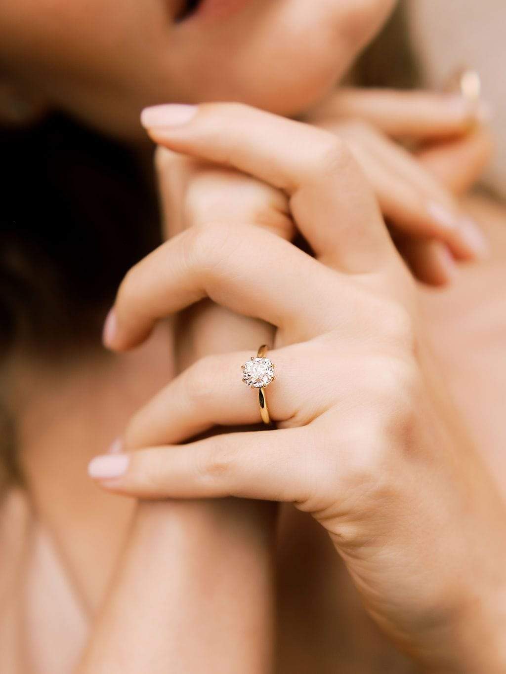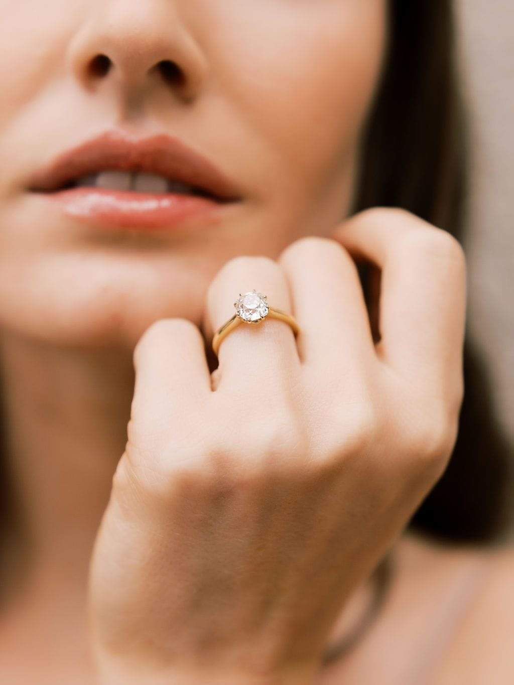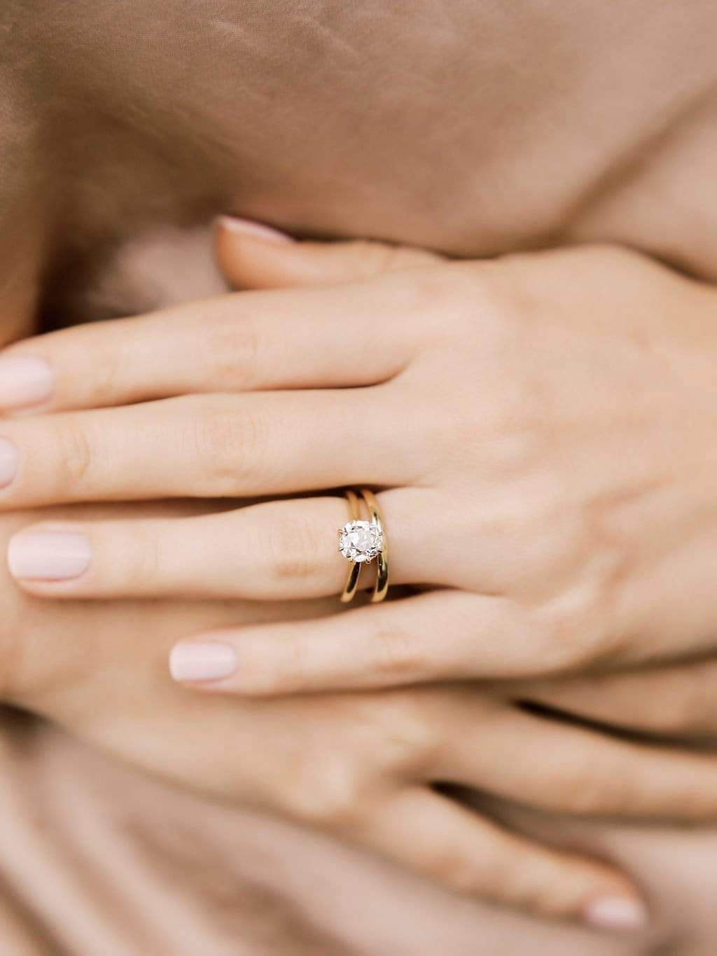 The Claire style is a new design for us that is a bit thicker than our Bella style but doesn't feel too chunky. We chose a gorgeous old mine cut diamond to center this beautifully simple piece.