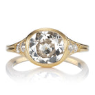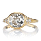 The Rosita 1.73 ring is an AB original design made right here in NYC. The ring centers a GIA-certified 1.73-carat Transitional Cut diamond of O-P Very Light Brown color, I1 clarity. On each shoulder are two bead-set Old Cut diamond of coordinating color and clarity. The stone is set in a bezel-set 18kt yellow gold setting. The ring is currently size 5.75 and can be resized!